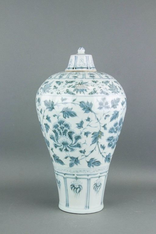 Chinese blue and white porcelain vase; of Meiping shape with knobbed cover; painted with leafy and floral pattern; H: 49 cm, D: 27 cm, 4 kg