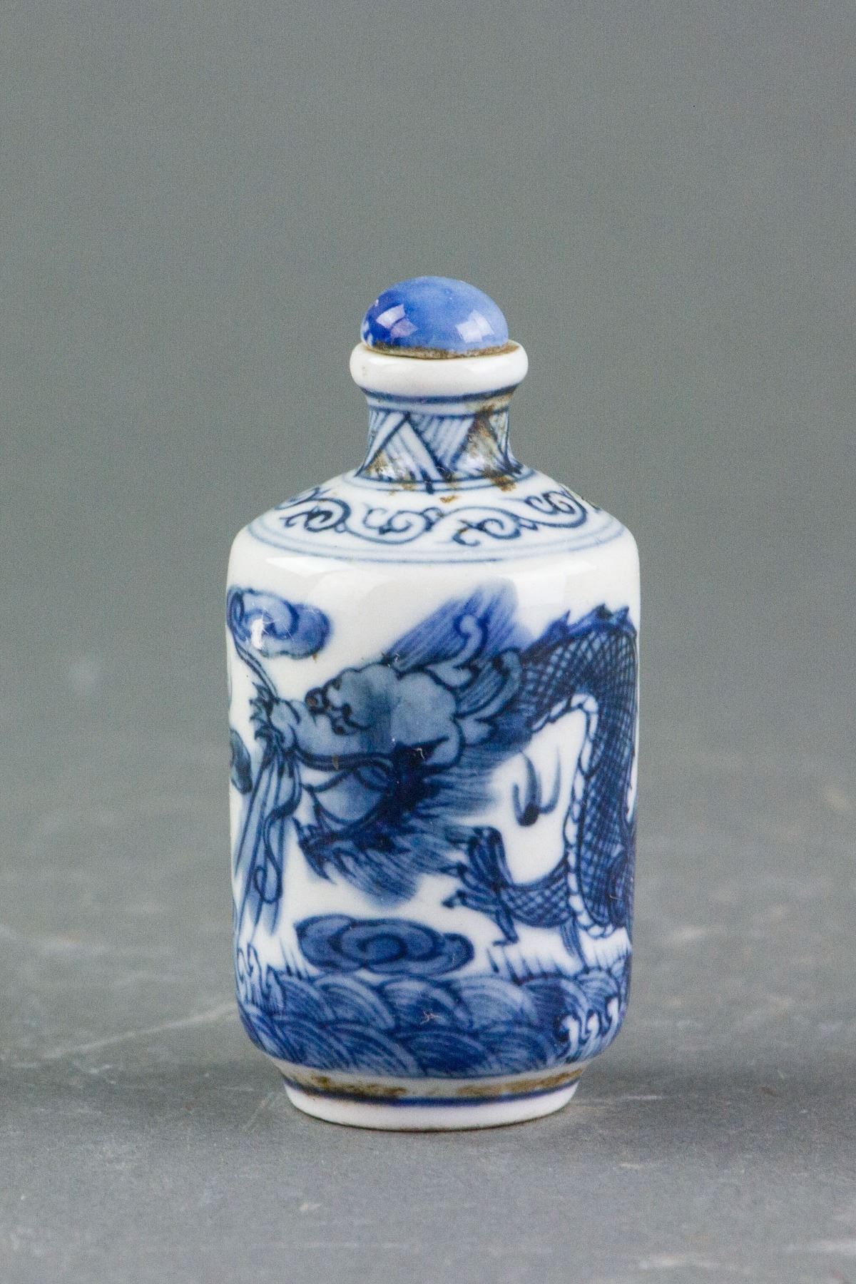 Chinese blue and white porcelain snuff bottle; of cylinder body with semi-sphere cap; painted with dragon and wavy pattern; four-character "Hong Yun Tang Zhi" mark on base; 6.5 cm x 3.5 cm, 50 grams