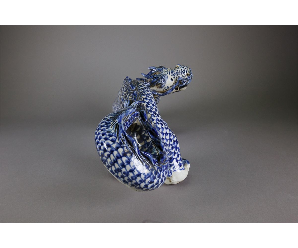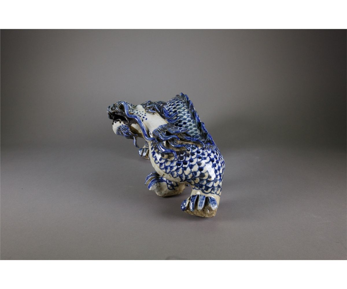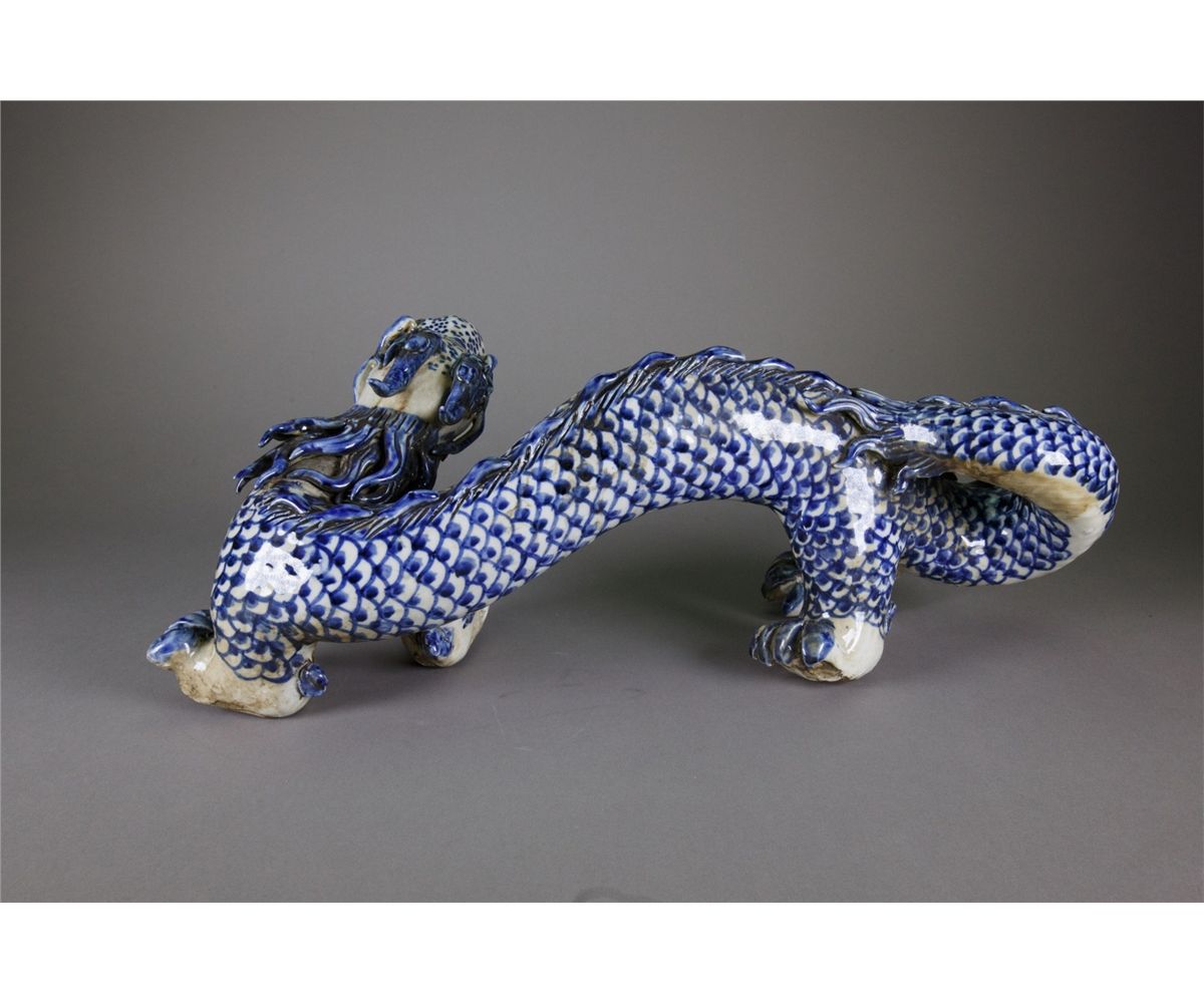 Chinese blue and white porcelain Chilong figure; depicting Chilong turning its head to the back; H: 17 cm, W: 47 cm, 2765 grams