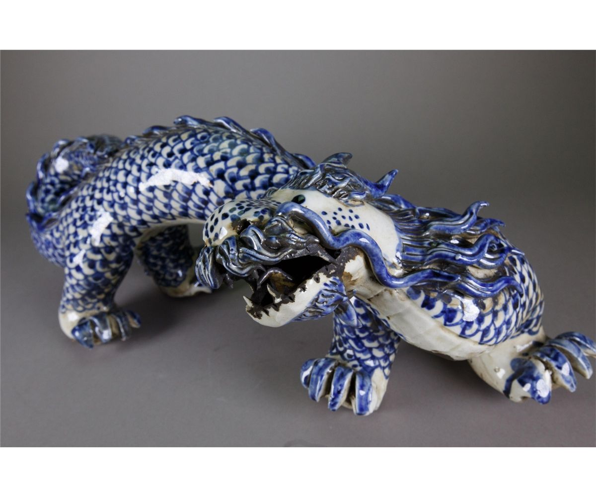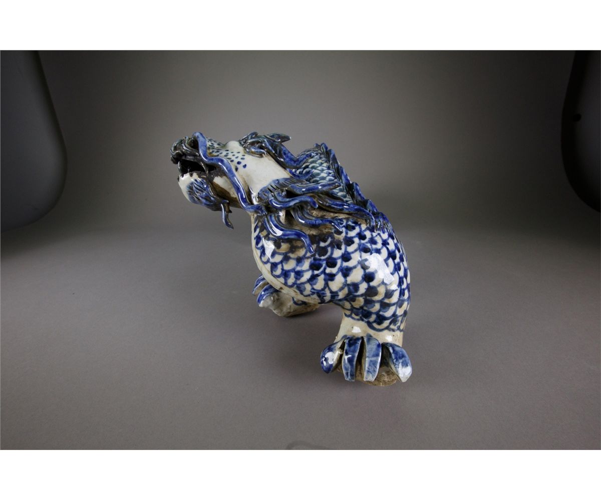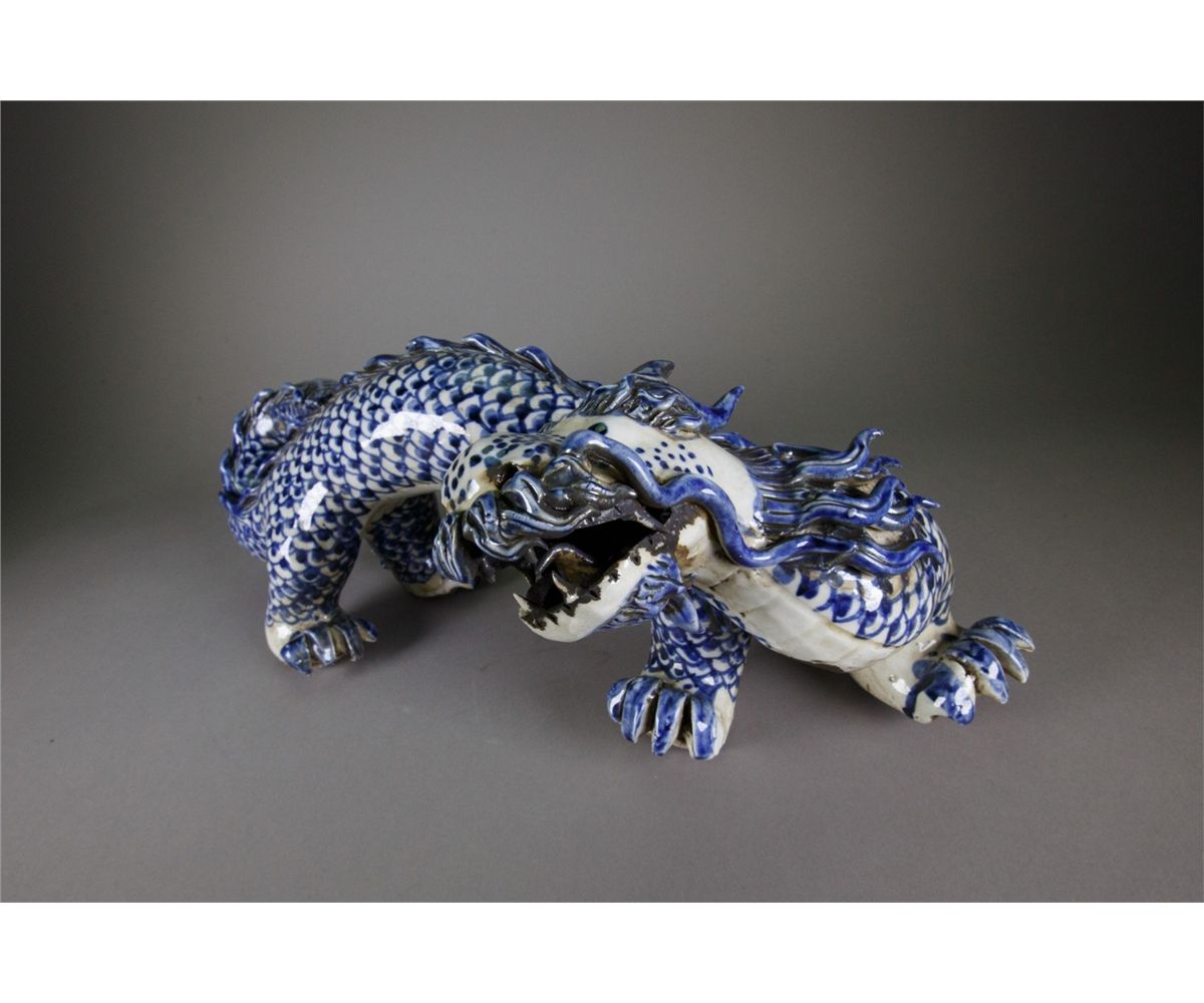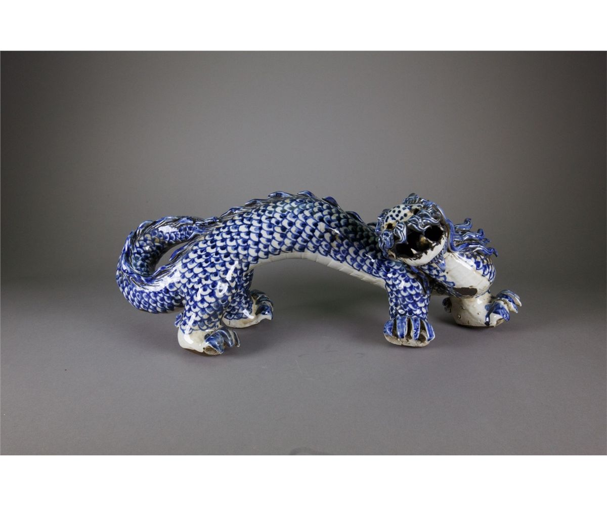 Chinese blue and white porcelain Chilong figure; depicting Chilong turning its head to the back; H: 17 cm, W: 47 cm, 2765 grams