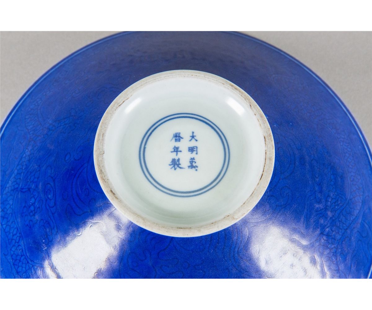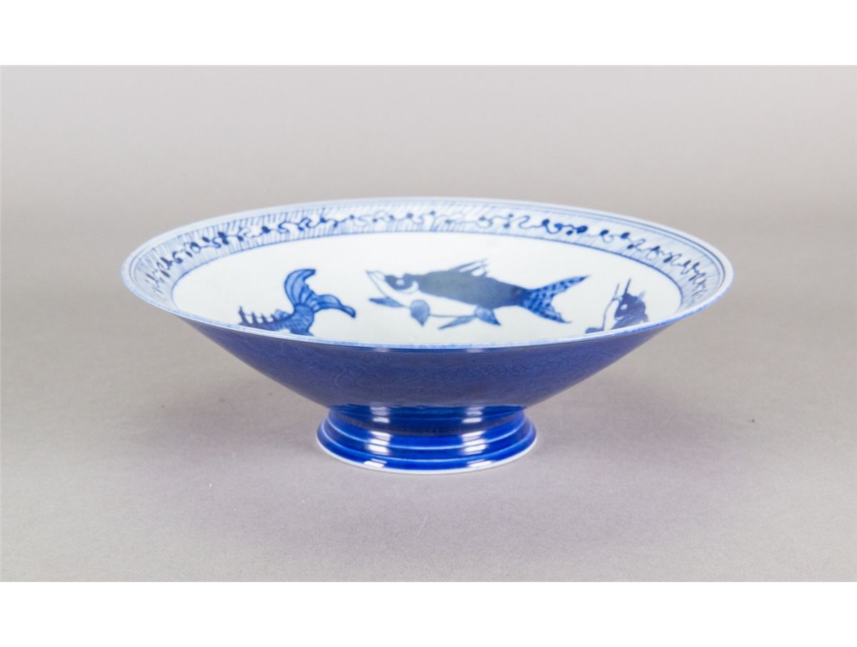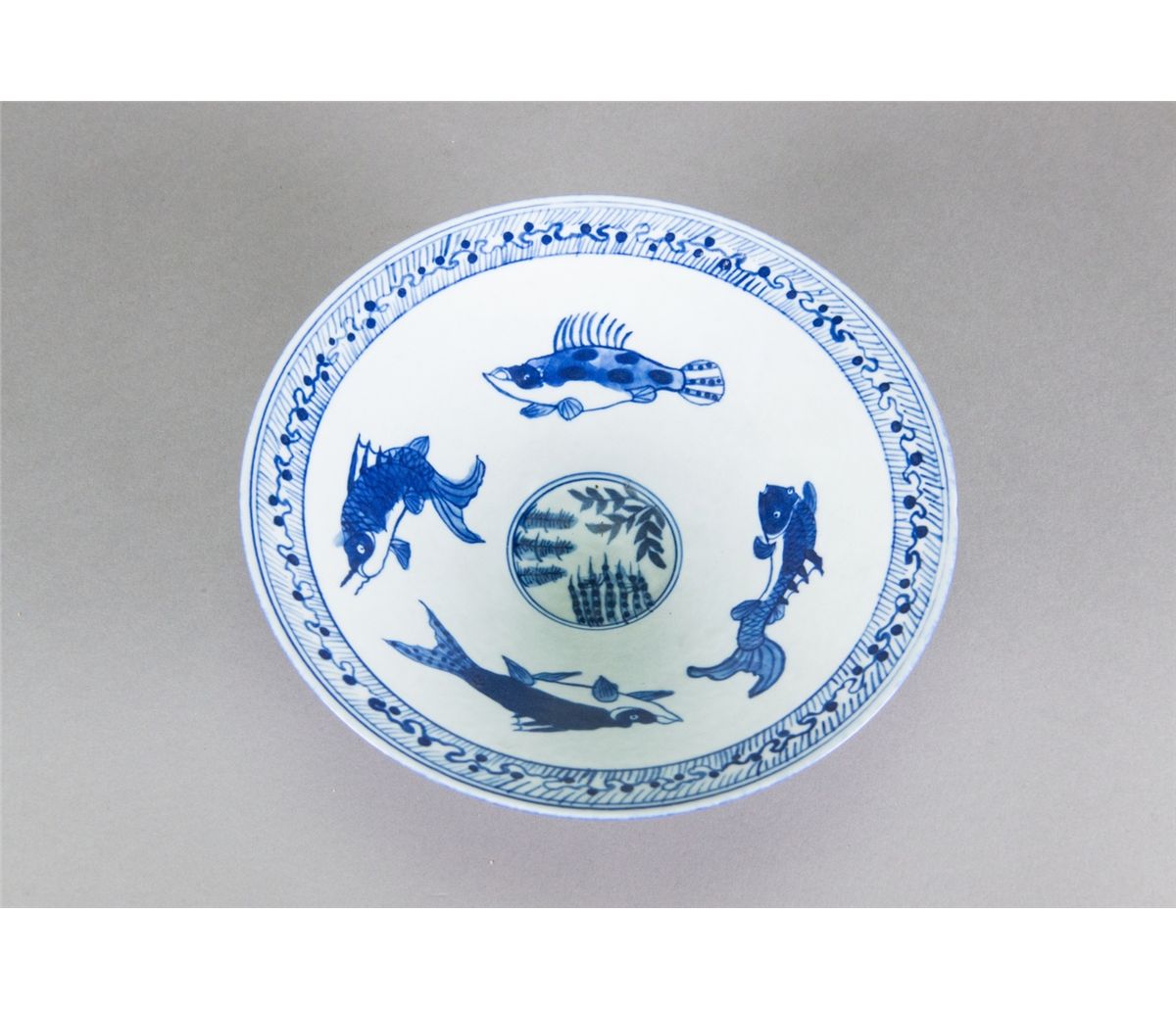 Chinese blue and white fish painted porcelain bowl; raised on high foot rim; decorated with fish patterns inside and blue glaze outside; six-character Wanli mark on base; H: 6.5 cm, D: 22 cm, 279 grams