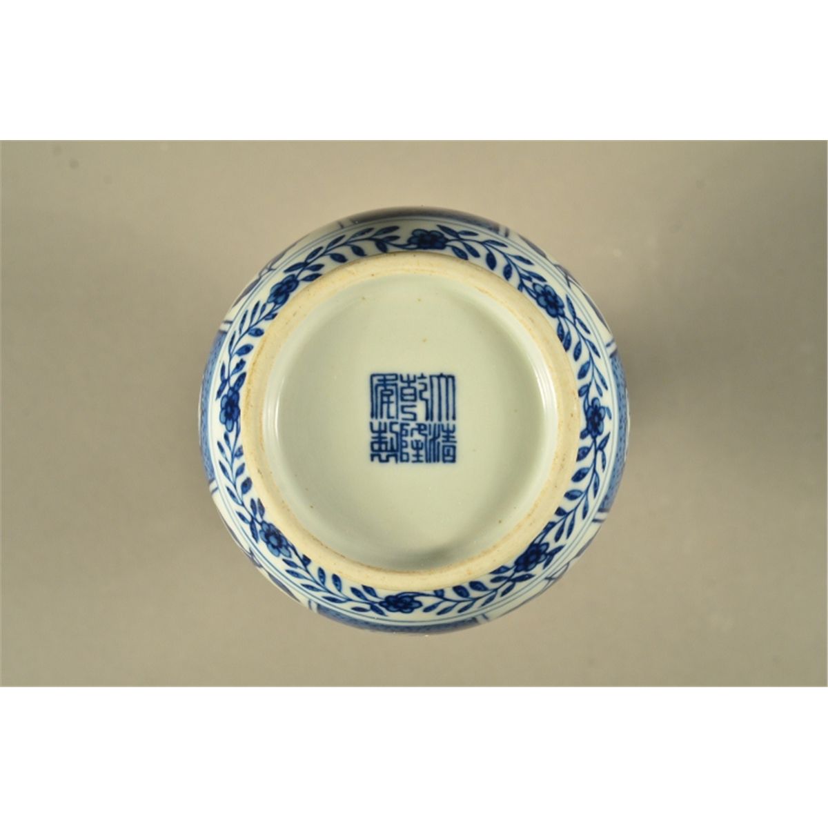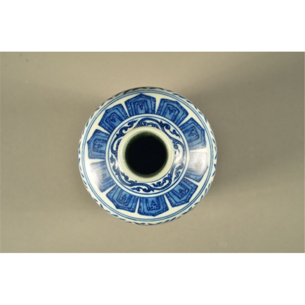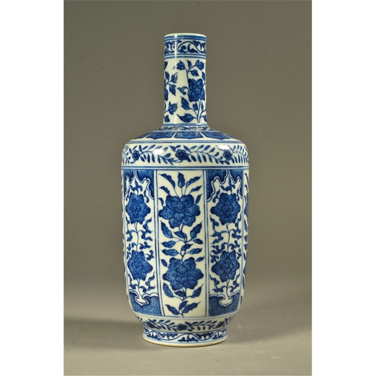 Chinese blue and white porcelain vase; of mallet form: featuring Kangxi style design of encircling pattern of panels containing two lotus flowerhead sprays; six-character Qianlong Mark; H: 25 cm, D: 10 cm