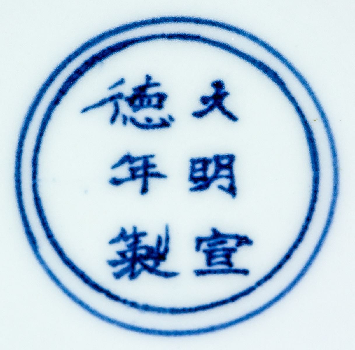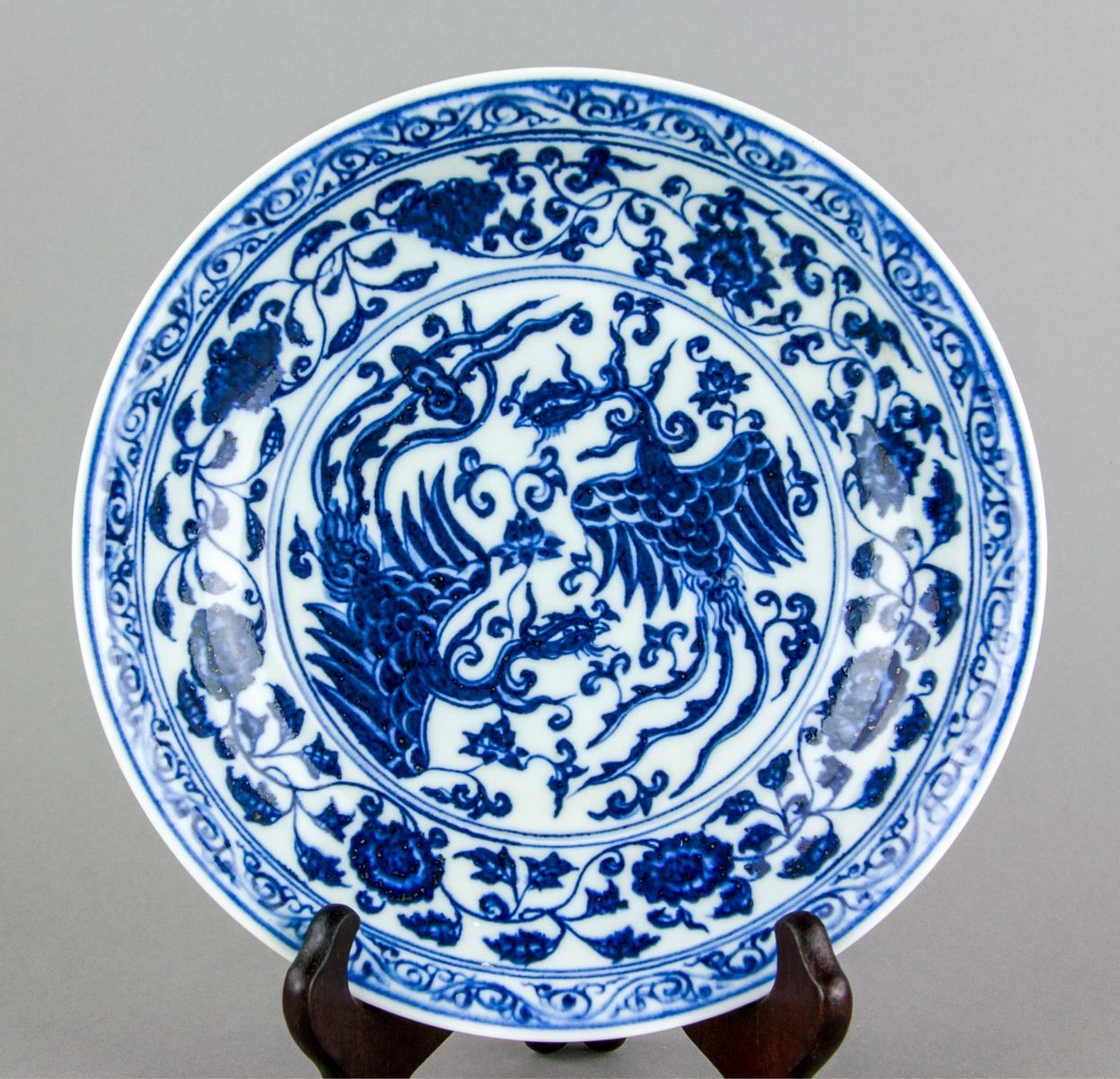 Chinese blue and white porcelain saucer; painted with double phoenix emblem framed by a band of floral scrollwork; six-character Ming Xuande mark on base; H: 4.3 cm, D: 21.1 cm, 391 grams