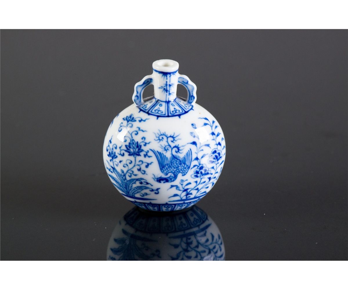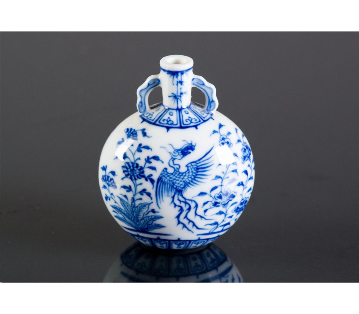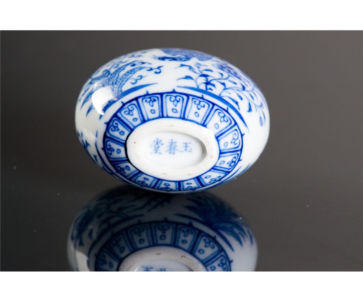 Chinese blue and white porcelain snuff bottle; with two ruyi ears on shoulder; featuring phoenix and flowers on body; three-character Yu Chun Tang mark on base; H: 6 cm, W: 4 cm, 35 grams