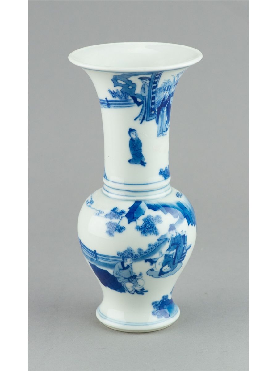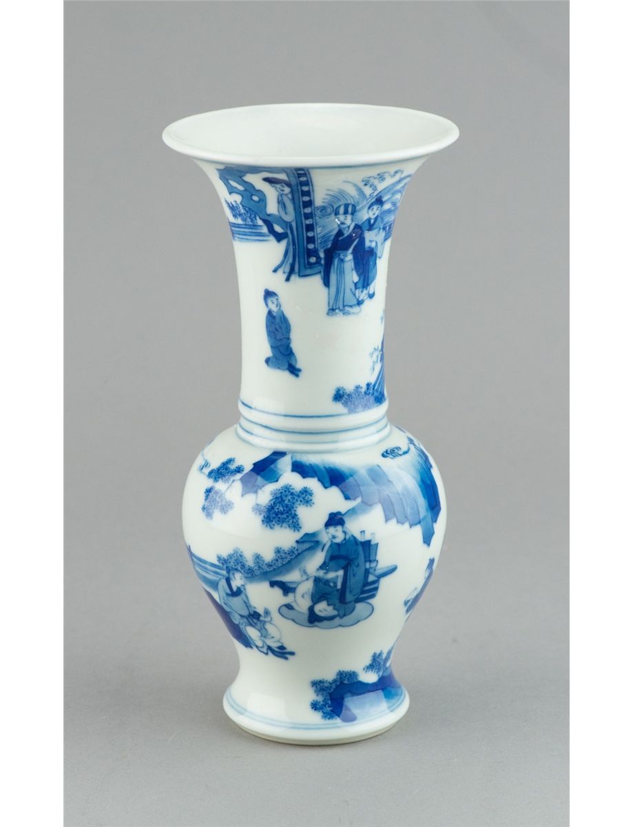 In classic Gu form, the body painted with court scene in underglaze blue, six characters Kangxi mark on base. H: 18 cm, D: 8.5 cm, 321 grams.