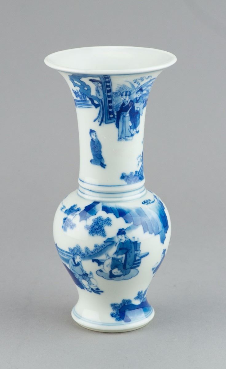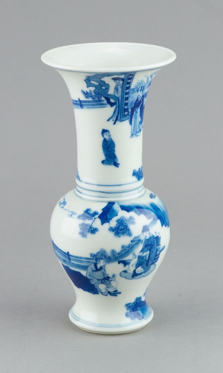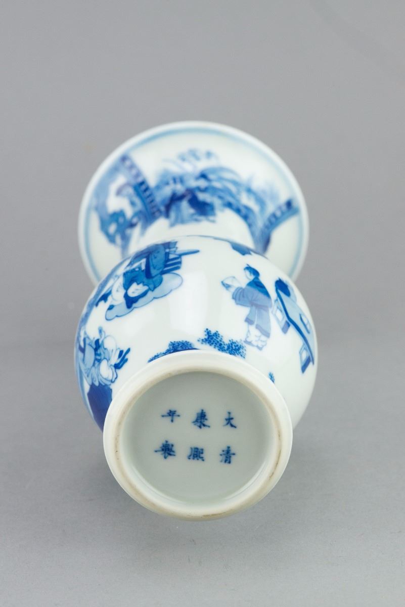 In classic Gu form, the body painted with court scene in underglaze blue, six characters Kangxi mark on base. H: 18 cm, D: 8.5 cm, 321 grams.