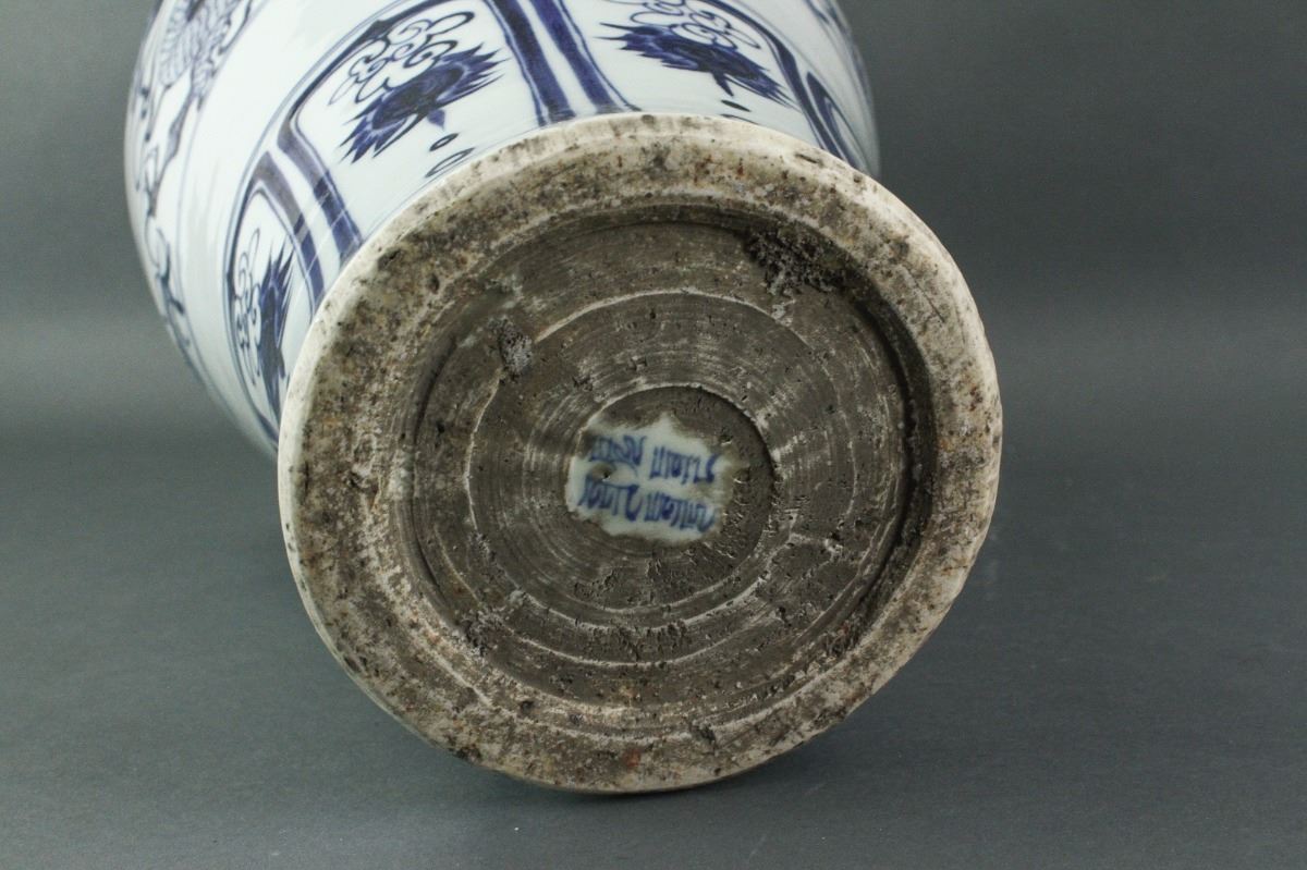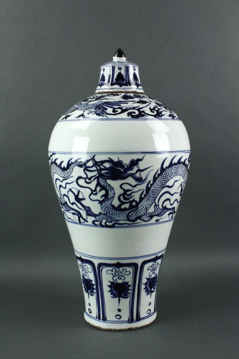 Chinese blue and white porcelain jar with cover; of Meiping form with a bell-shaped cover; featuring a band of phoenix on shoulder, a band of striding dragon on body and a band of lotus pedals on bottom; with red seal mark on body and Tibetan characters mark on base; H: 53 cm, D: 26 cm, 4881 grams