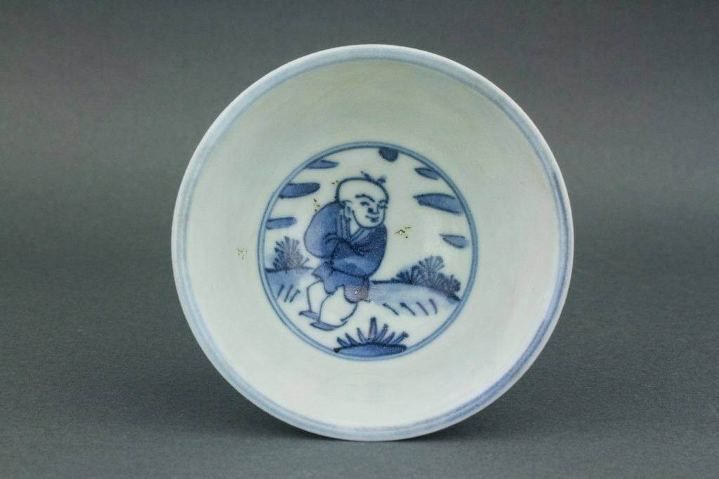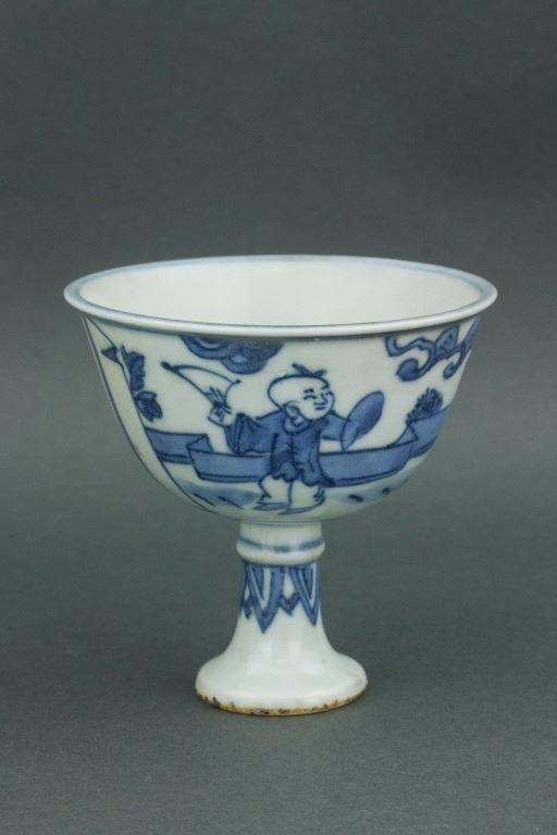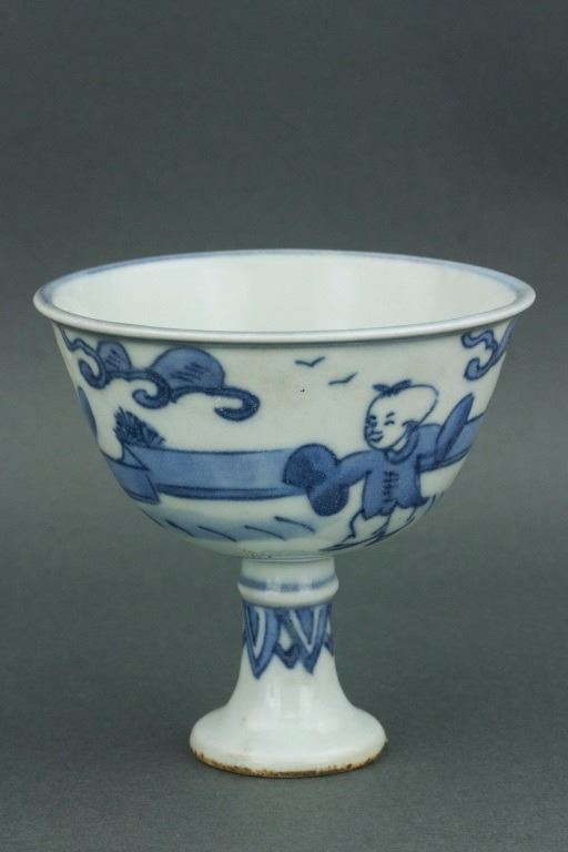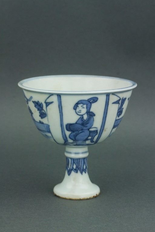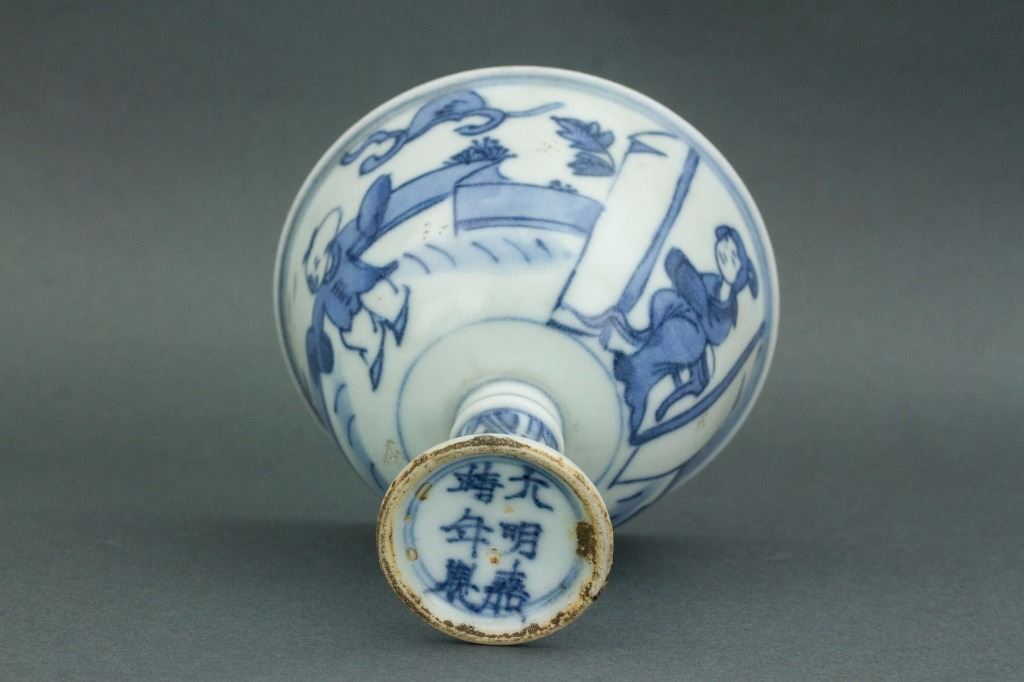 Chinese blue and white porcelain stem cup; of bell shape with flaring rim supported on slender foot; painted a lady and playing children; leafy pattern decoration on foot; with six-character Jiajing mark on base; H: 9.5 cm, W: 9.5 cm, 124 grams