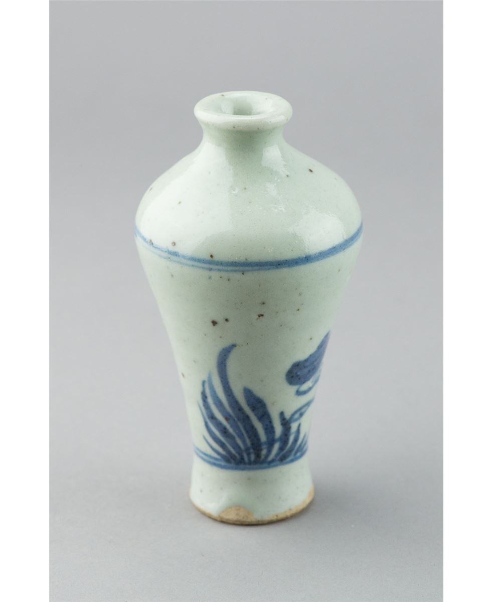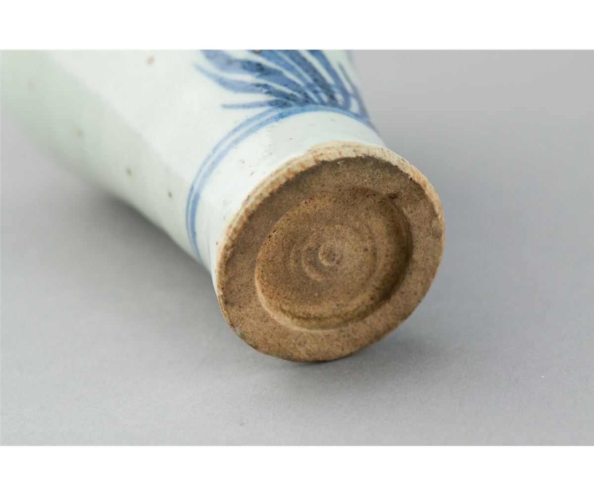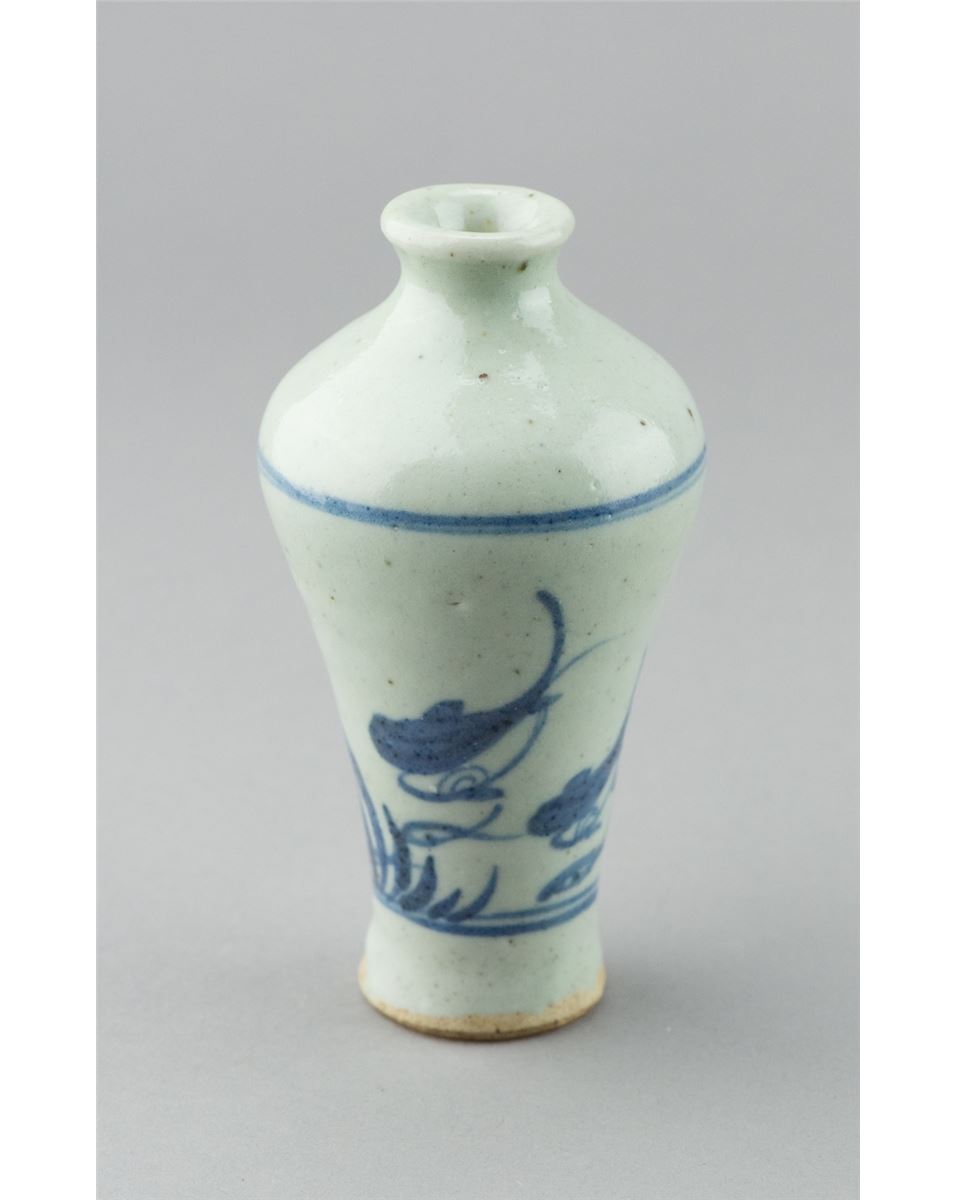 Small Chinese blue and white vase, Ming or Yuan Period, of baluster form, featuring simplistic lines and shapes. H: 11 cm, D: 6 cm, 152 grams.