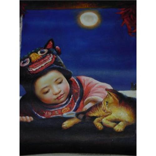 Chinese Baby Girl w/ Cat, Mint. Original painting done by Zhoukai, a member of the artist association of china. Measurements are 20 x 24.