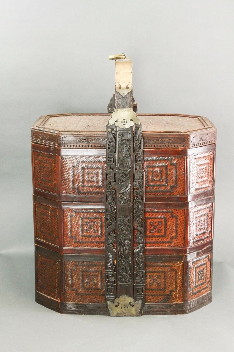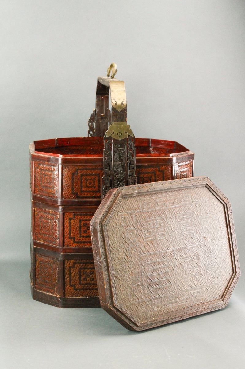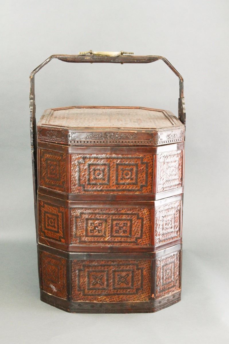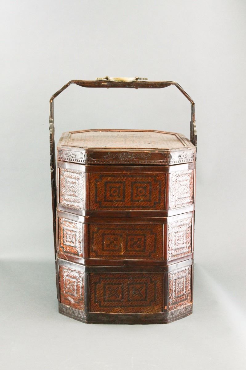 Chinese bamboo basket; Qing period; comprised of three octagon compartments with a cover; the wood handle decorated with folk tale carvings; H: 67 cm, W: 39 cm, L: 49 cm, 6 kg