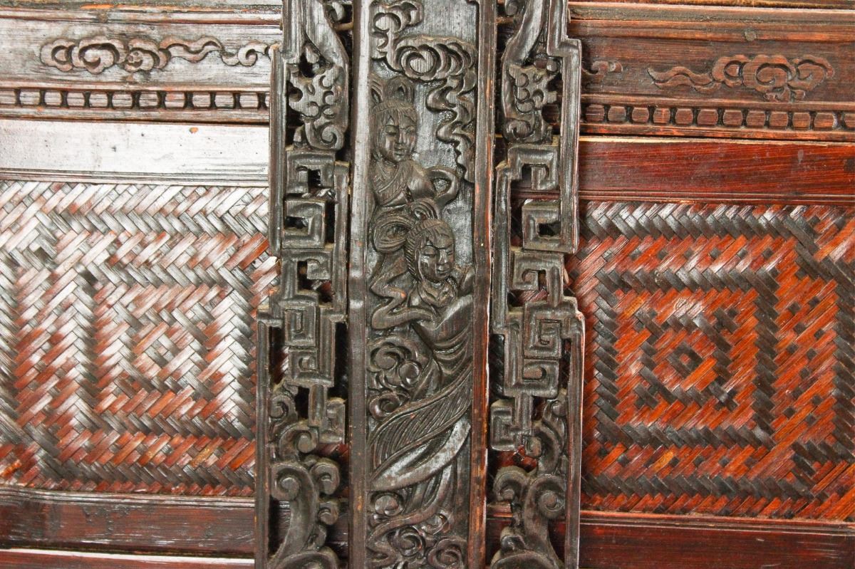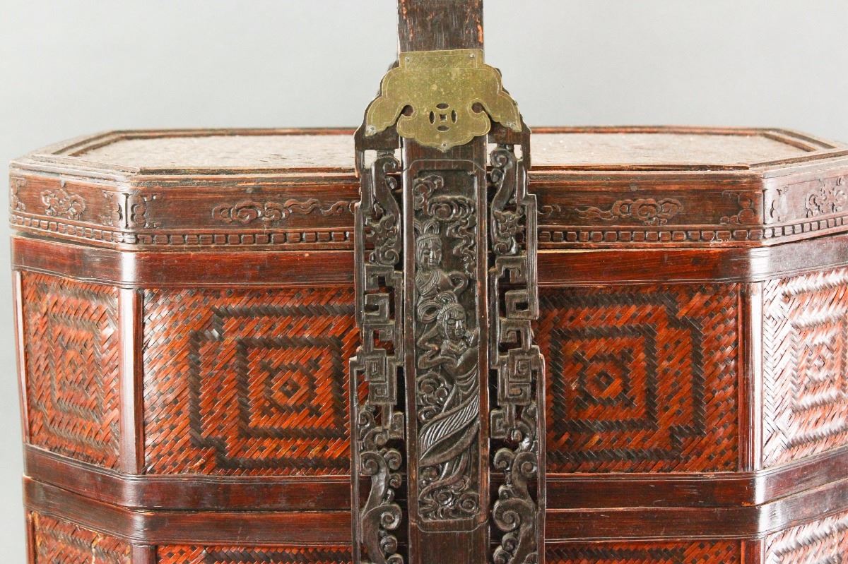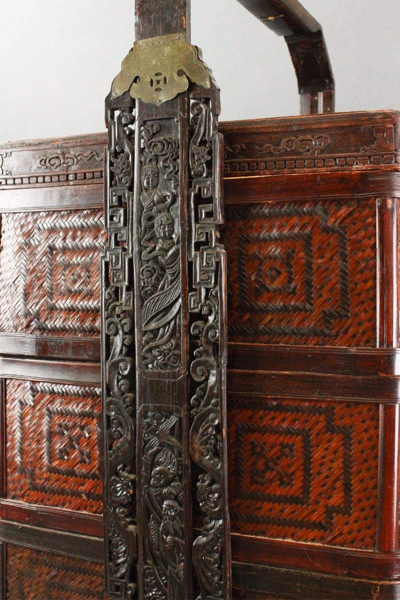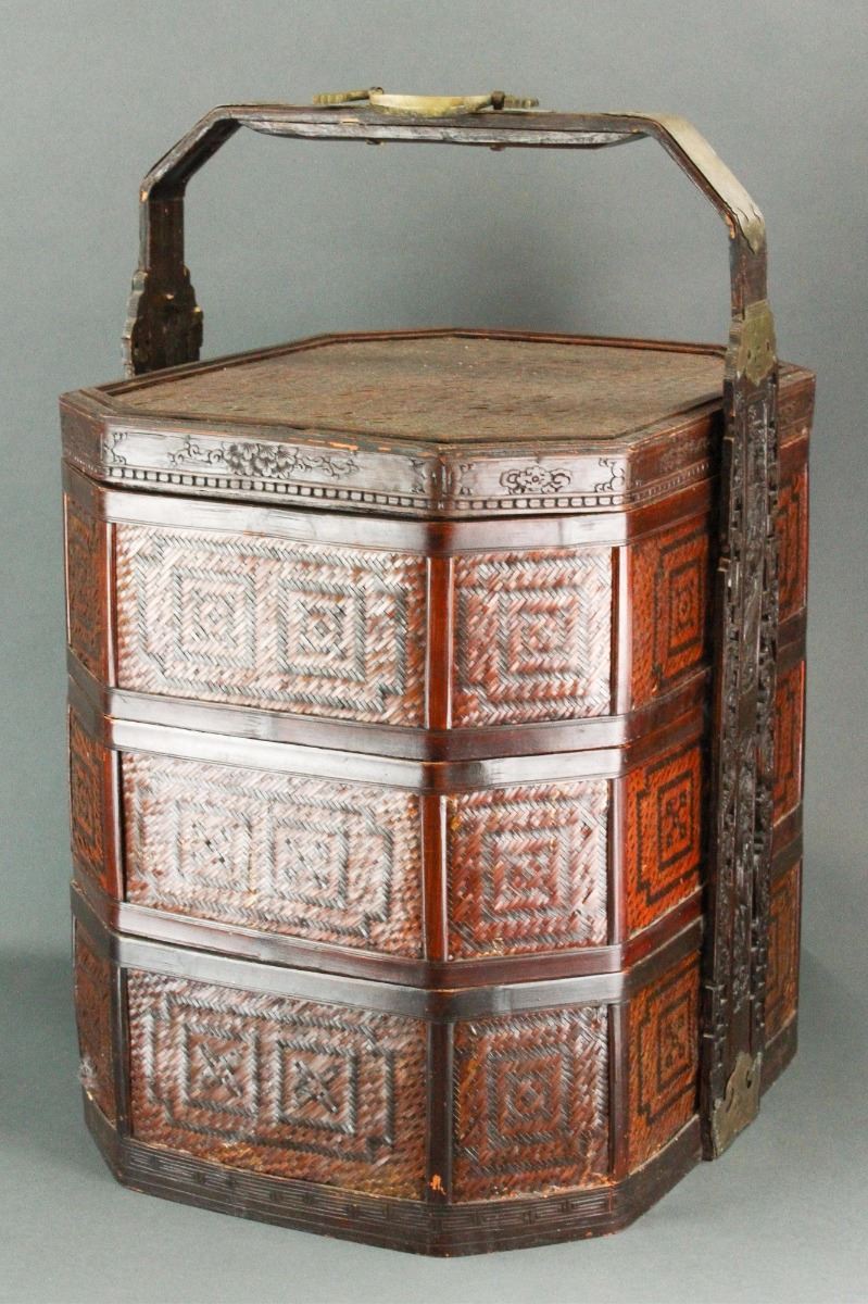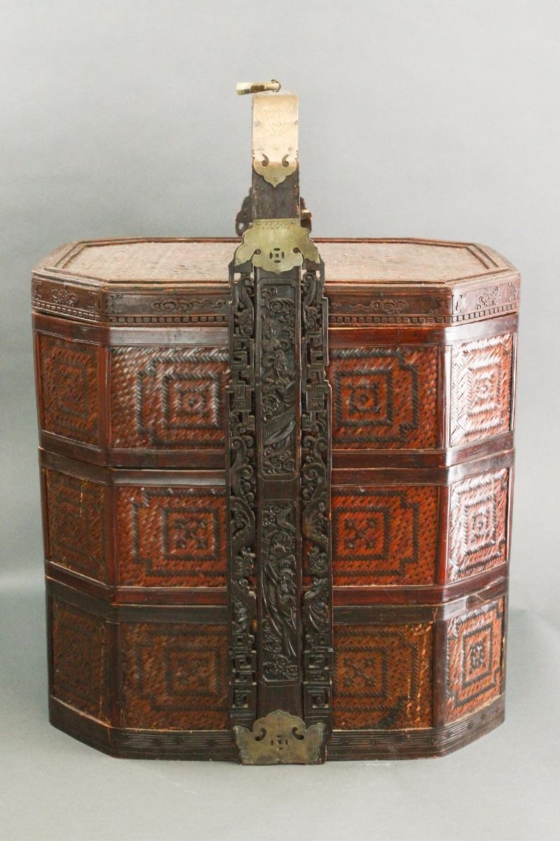 Chinese bamboo basket; Qing period; comprised of three octagon compartments with a cover; the wood handle decorated with folk tale carvings; H: 67 cm, W: 39 cm, L: 49 cm, 6 kg