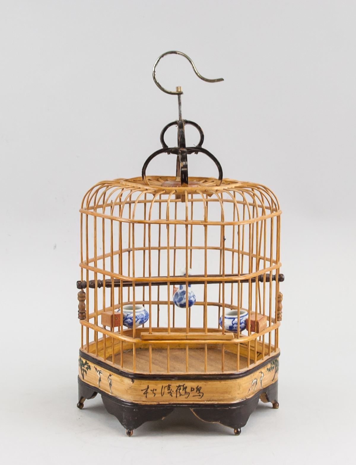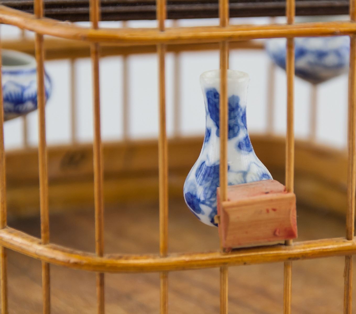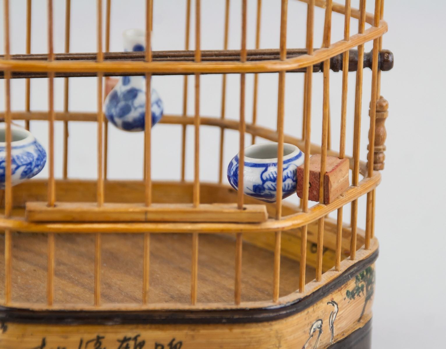 Chinese bamboo bird cage. With 3 blue and white porcelain water pot feeders inside. With hanging hook. 32 x 17 cm, 172 grams