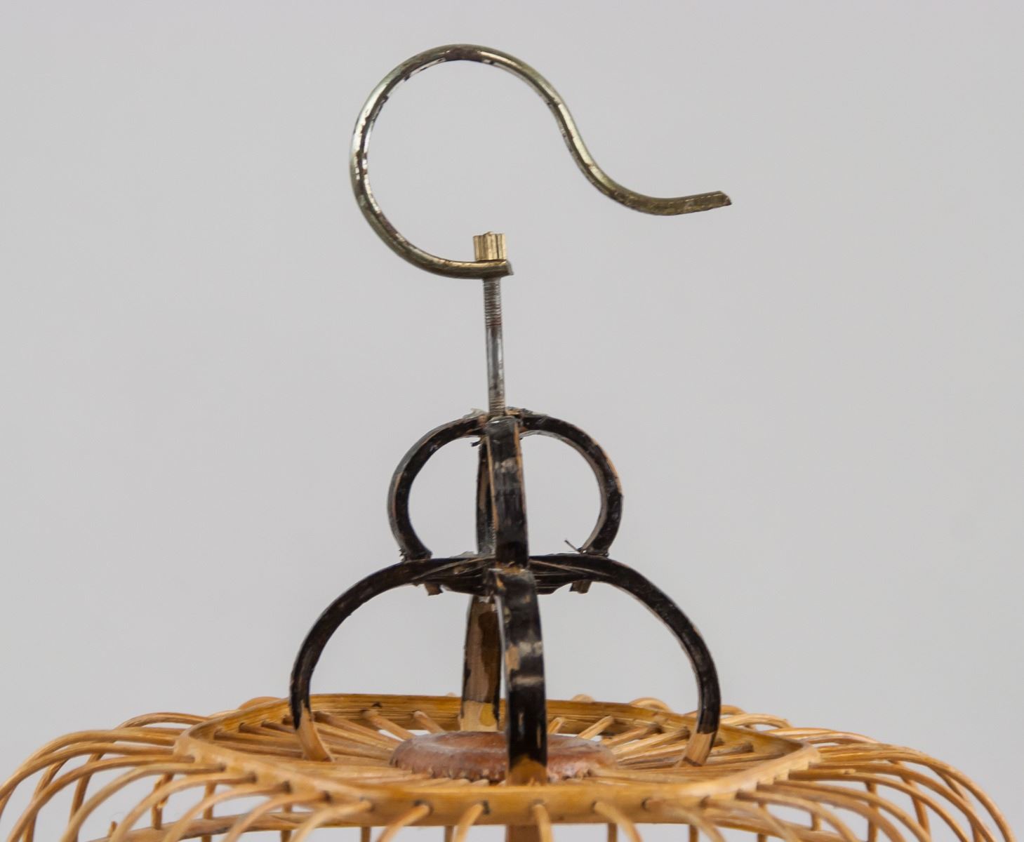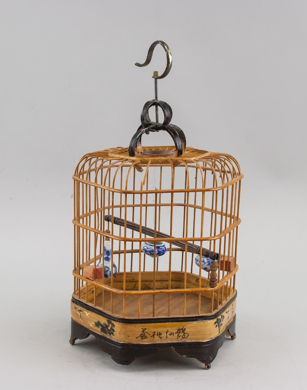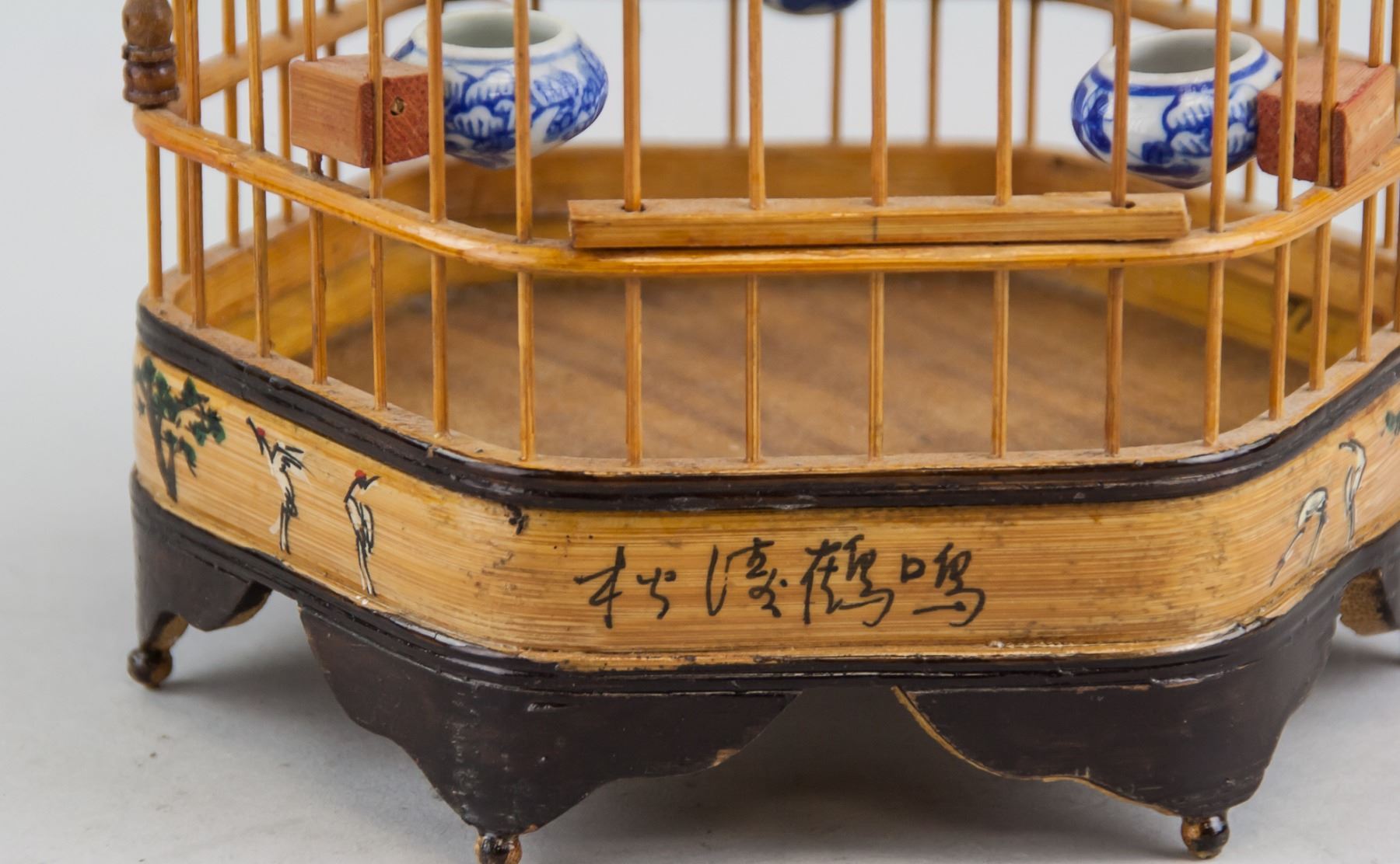 Chinese bamboo bird cage. With 3 blue and white porcelain water pot feeders inside. With hanging hook. 32 x 17 cm, 172 grams