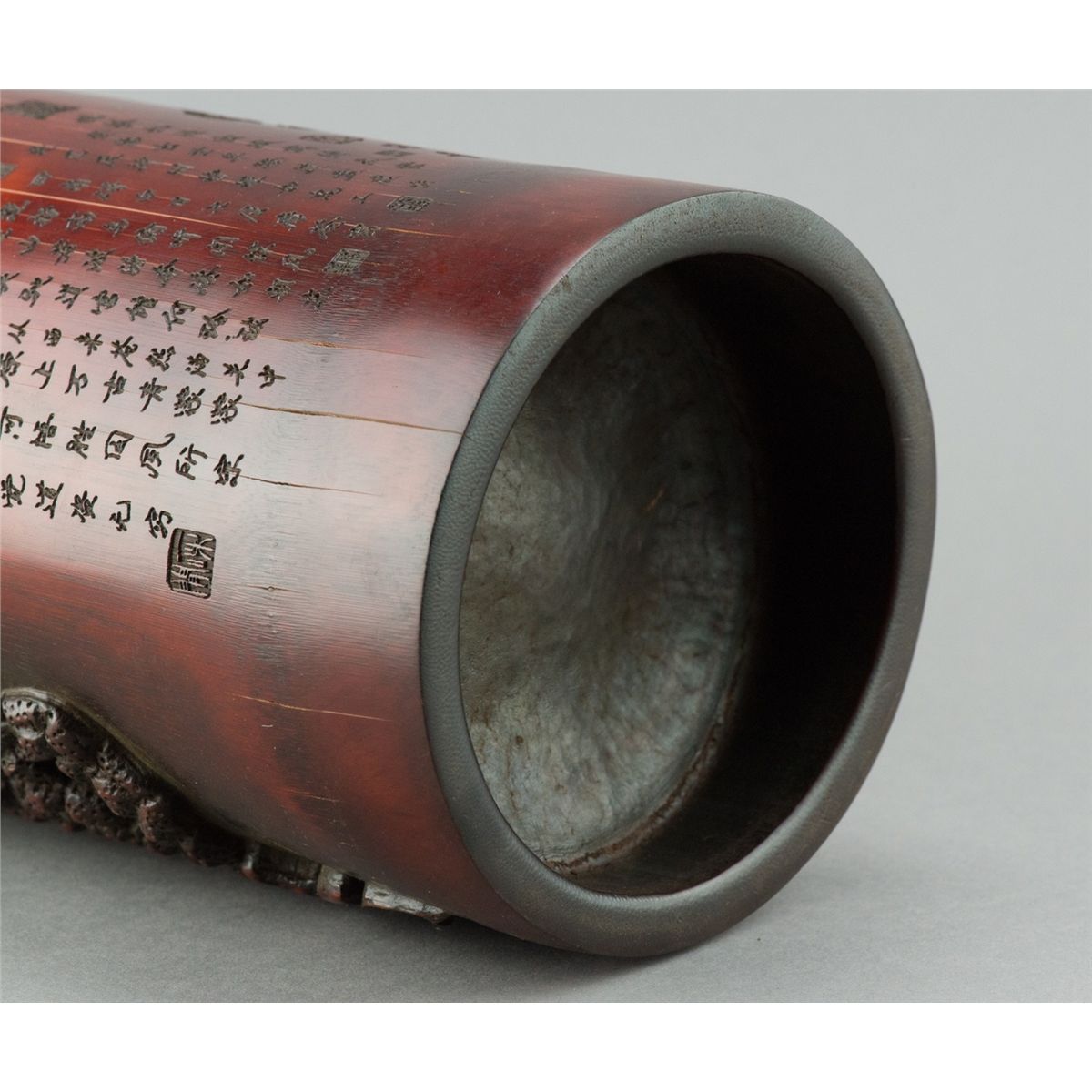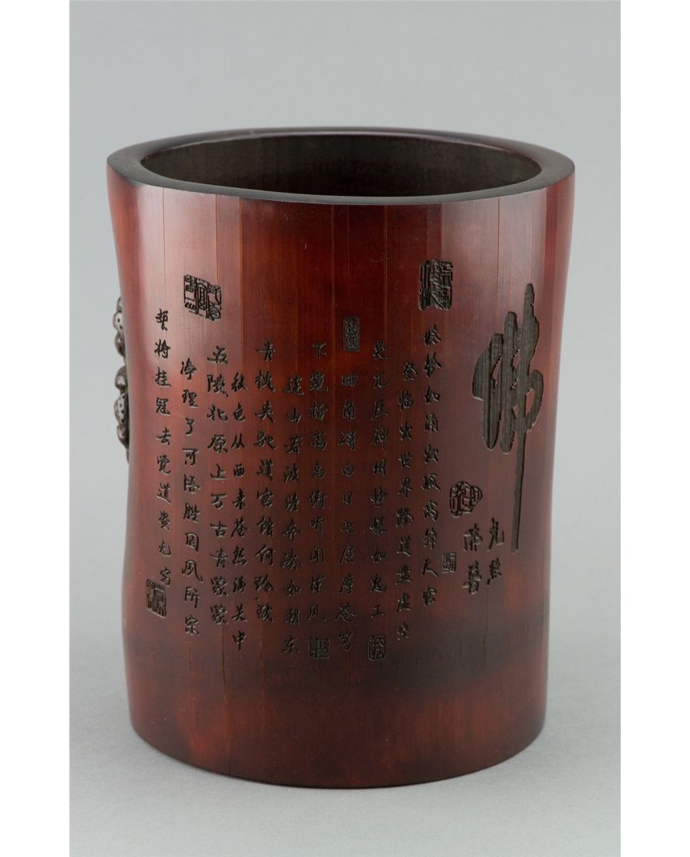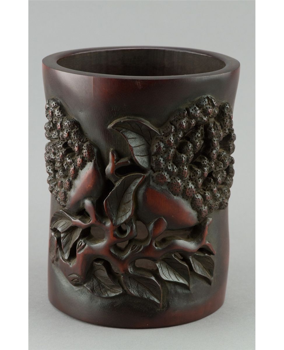 Chinese bamboo carved brushpot, featuring pair of citrus fruits on front and Buddhist script on verso. H: 18 cm, D: 13 cm, 872 grams.