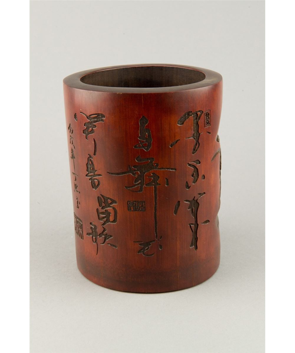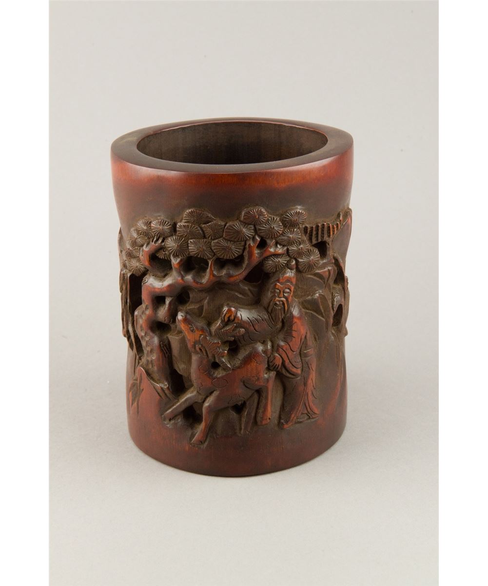 Fine Chinese bamboo carved brushpot, decorated with sage, deer and pine trees, with Chinese scripts and seals on verso; H: 16.5 cm, D: 13 cm, 480 grams