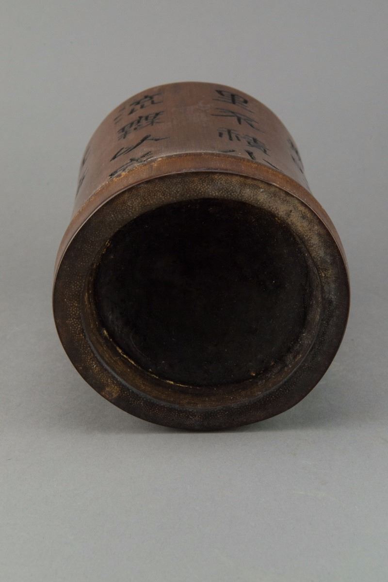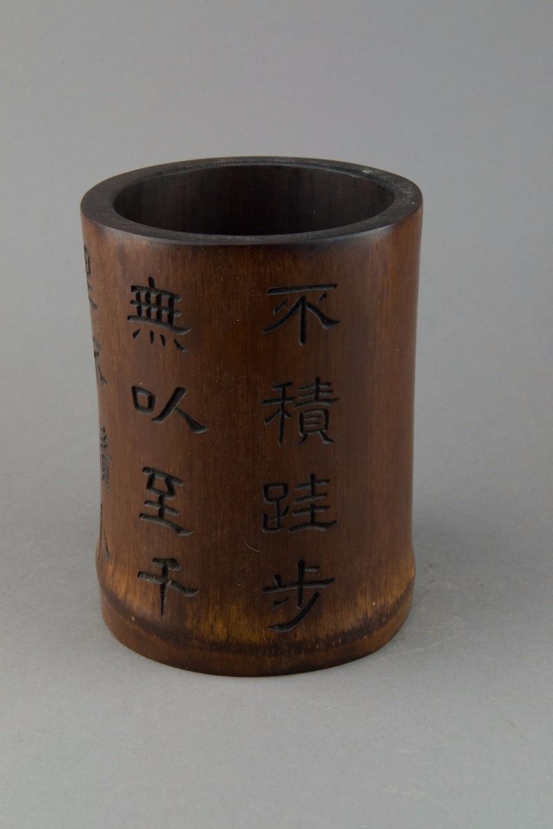 Chinese bamboo brushpot carved scripts. H: 16 cm, D: 13 cm, 474 grams.