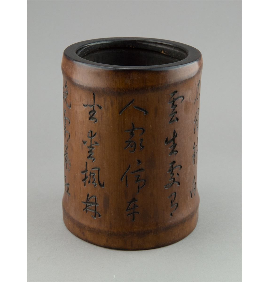 Chinese bamboo brushpot, the body carved Chinese script, signed. H: 17.5 cm, D: 12.5 cm, 714 grams.