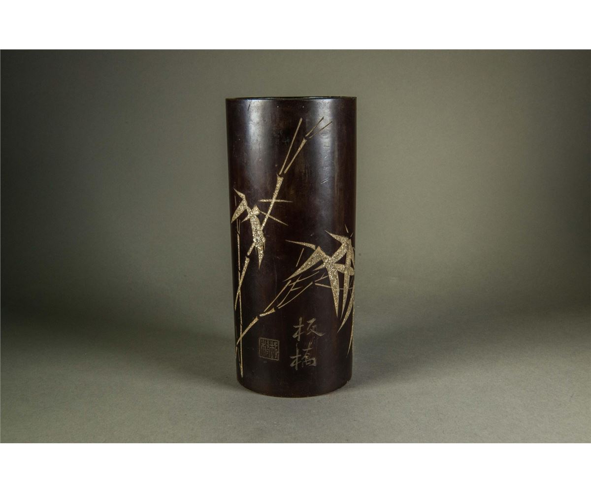 Chinese bamboo carved brush pot; of cylindrical form; featuring carvings of bamboo and signed by Banqiao; H: 25 cm, W: 11 cm, 492 grams