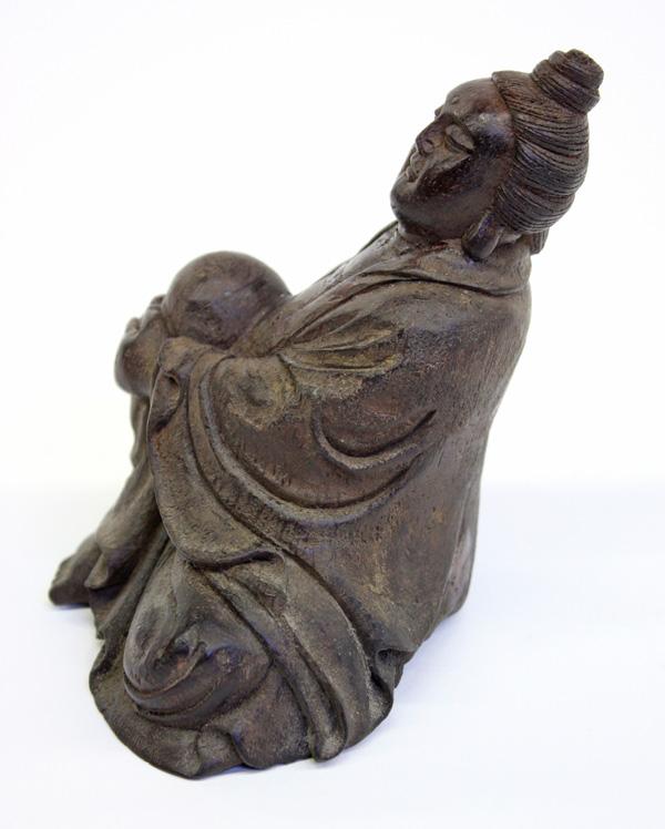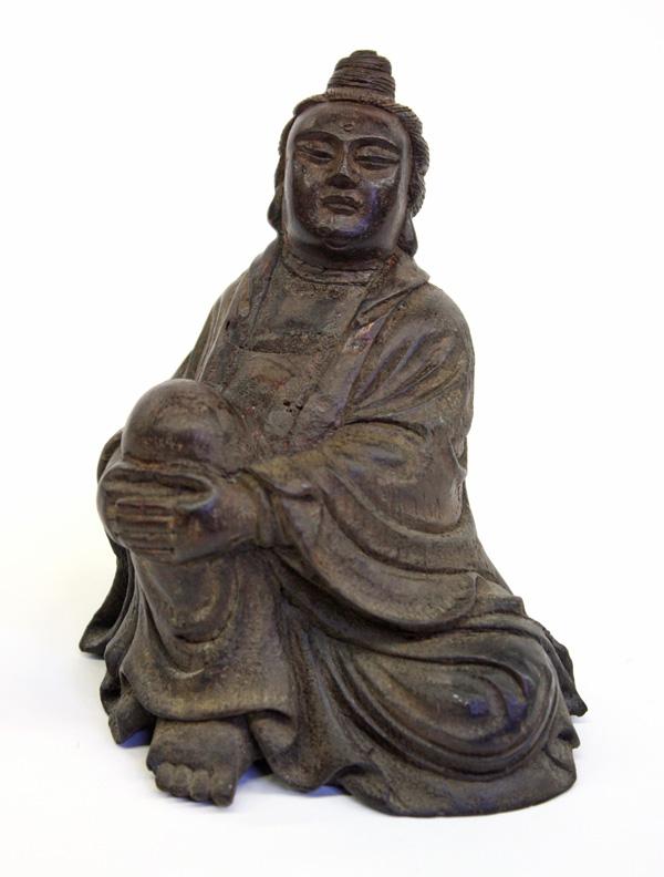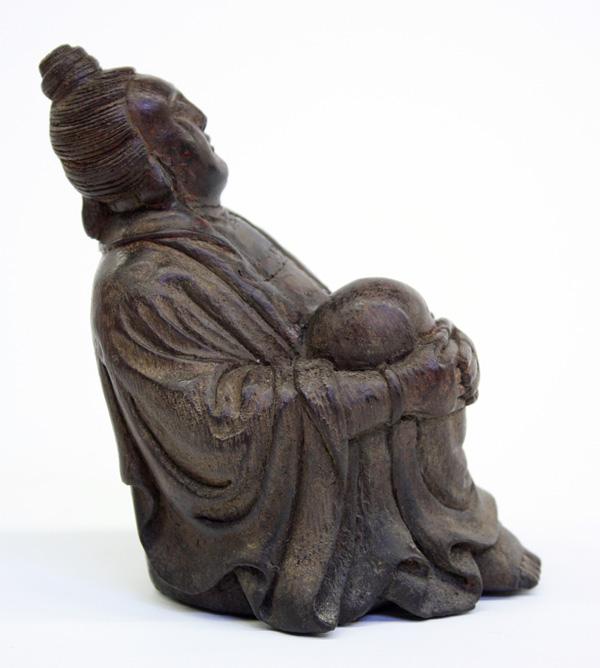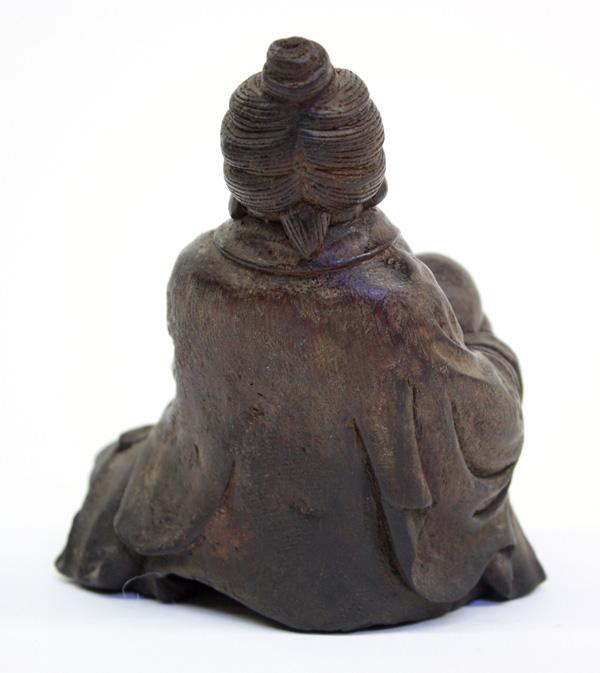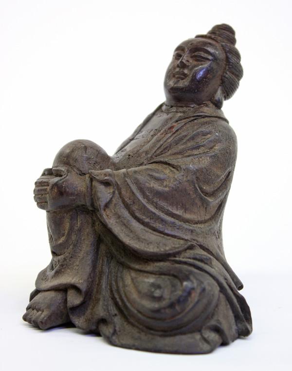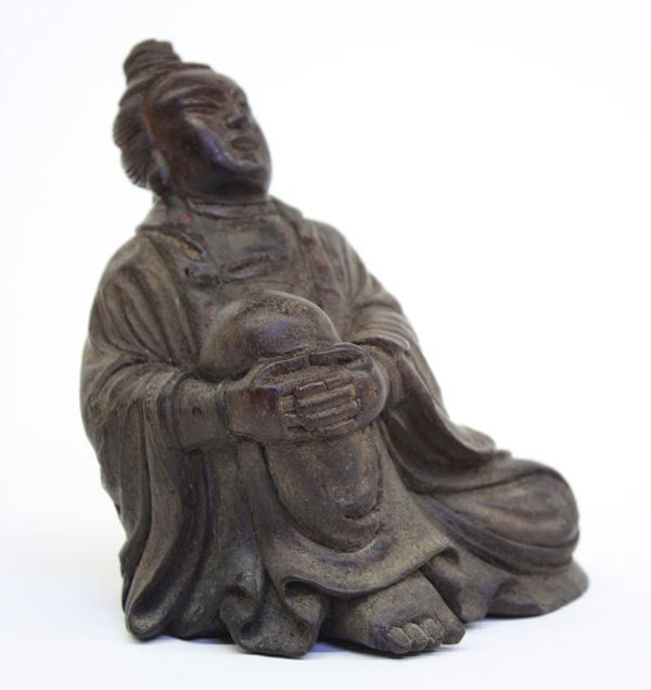 Chinese bamboo carving of an immortal, the figure fashioned with an aristocratic face and seated in royal ease with his hands wrapped around the knee, the flowing robes rendered with rhythmic folds, 4.5''h