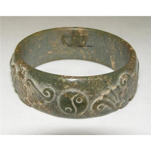 This green color jade stone bangle is carved with bats and " Tai Chi" alternatively. Bats symbolize luck and happiness and "Tai Chi" symbolize Yin / Yung. Chinese people like to wear jade bangle because jade has been claimed as a protection ornament. Even though you believe it or not, it is a pretty piece to be a gift or personal use.