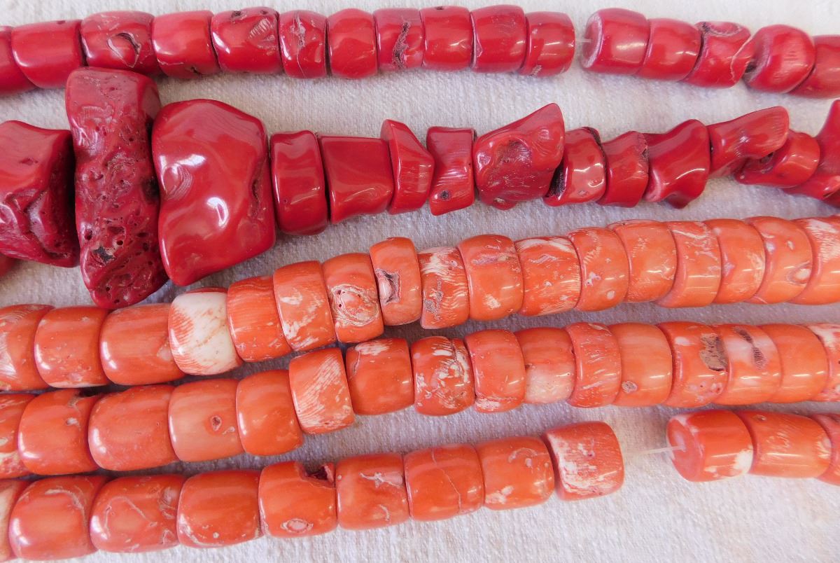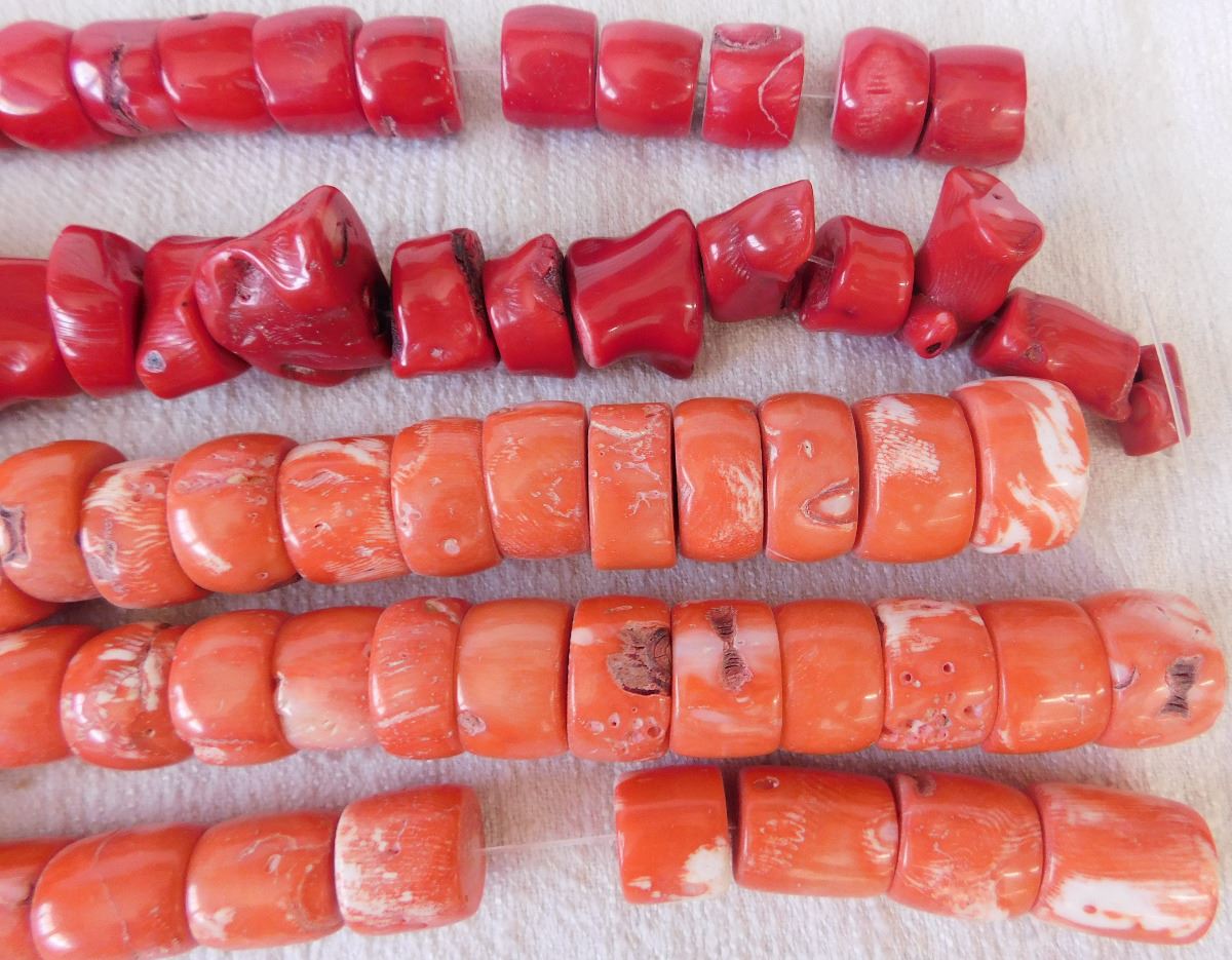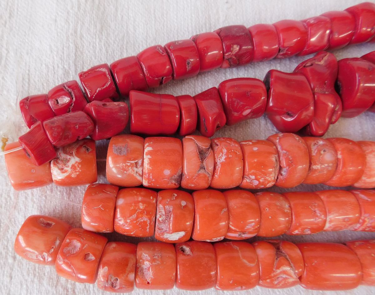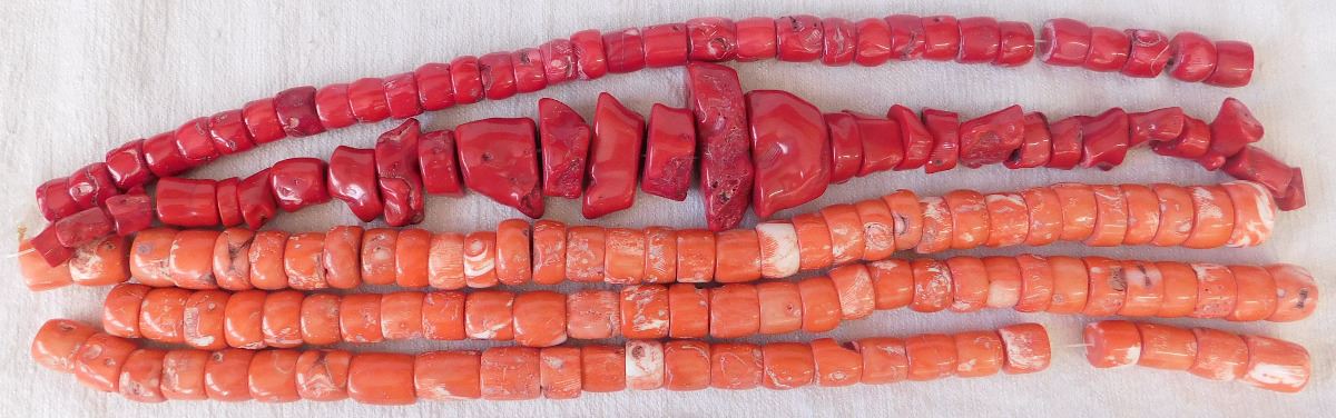 Chinese Bead Collection, circa 1940s. Made of coral, pink and red, the lot includes 5 beaded strands of 17" in length. From the South China Sea. Condition: Need re-stringing, see images. Shipping: $18.50 w/insurance and signature.