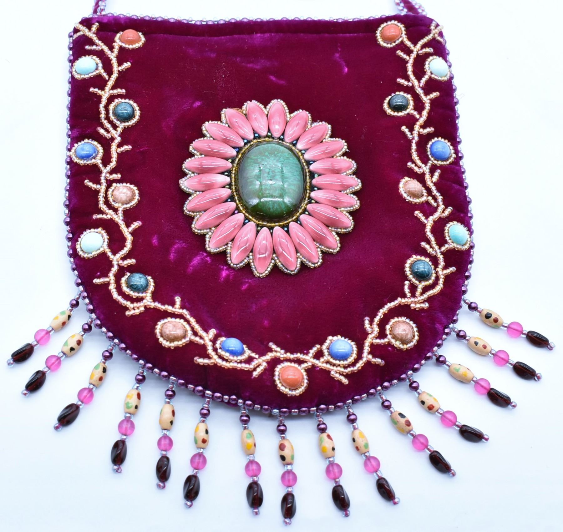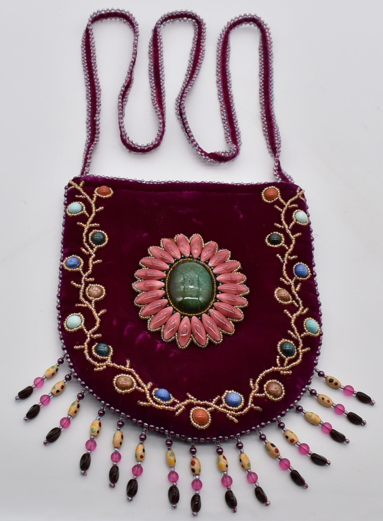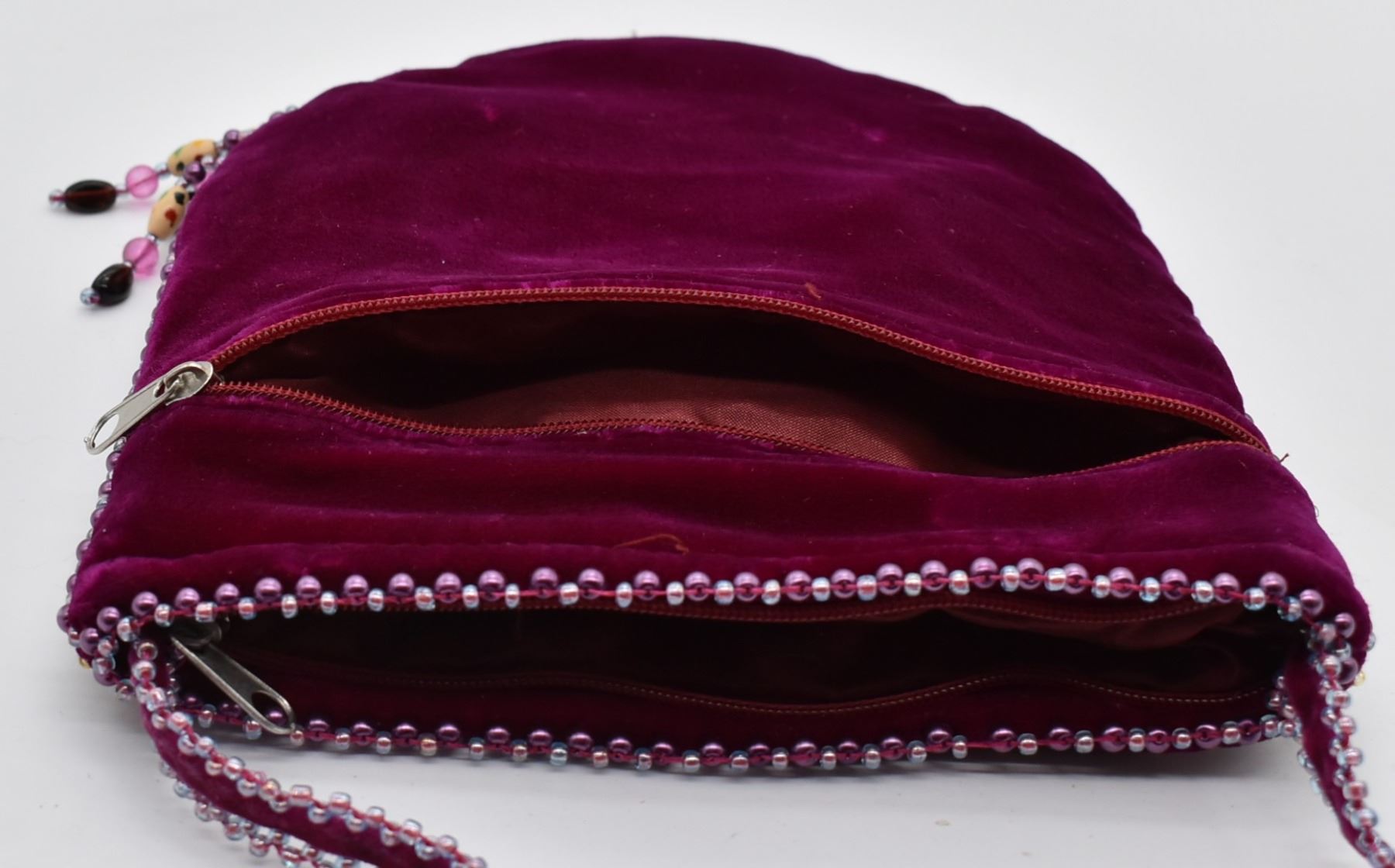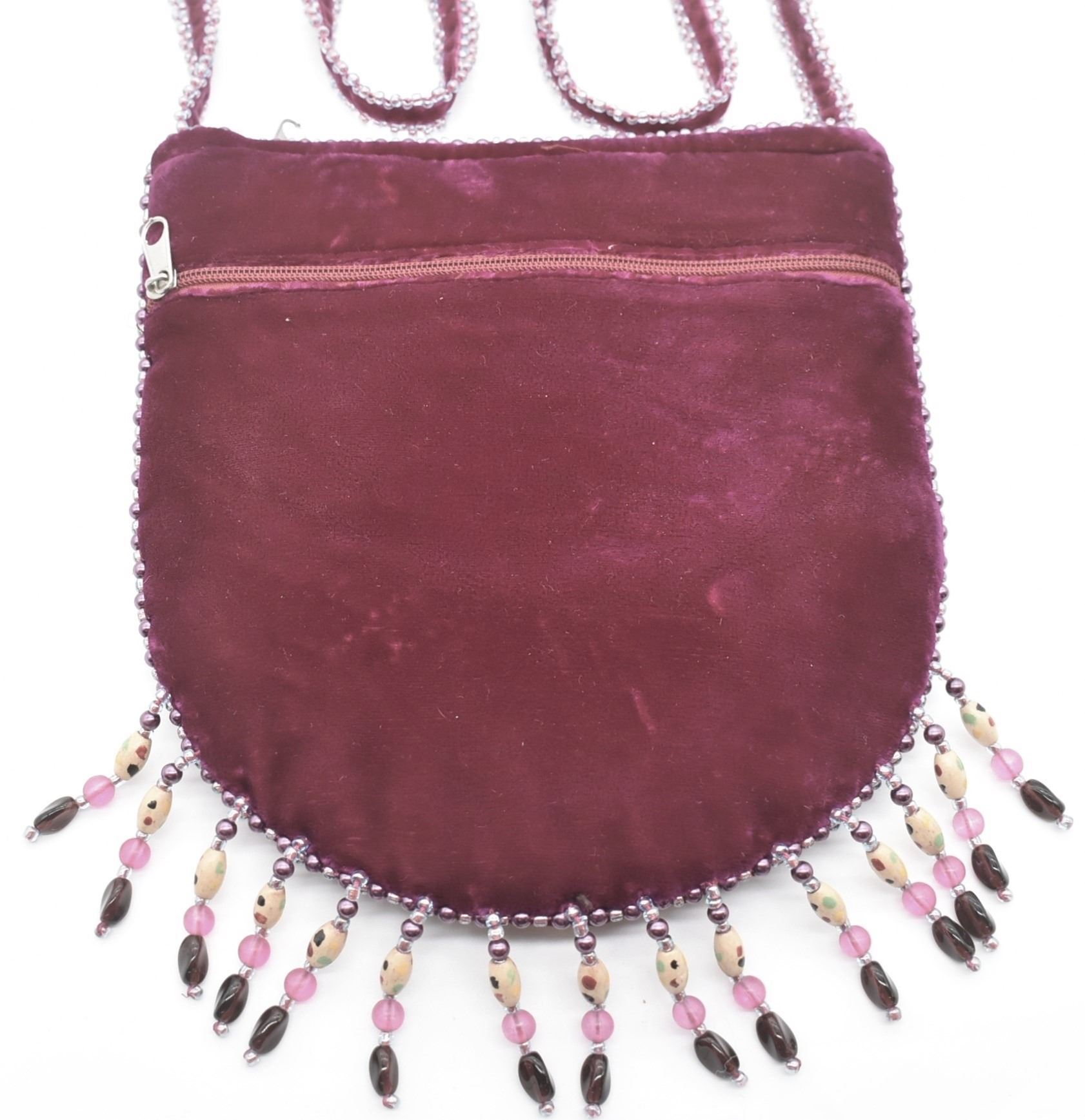 Chinese Beaded Velvet Purse, measures 7'' x 7.5'', embellished with beaded fringe and faux stone cabochons, zippered closure, strap measures 47''L end to end, zippered back pocket, satin lining, missing bead on strap