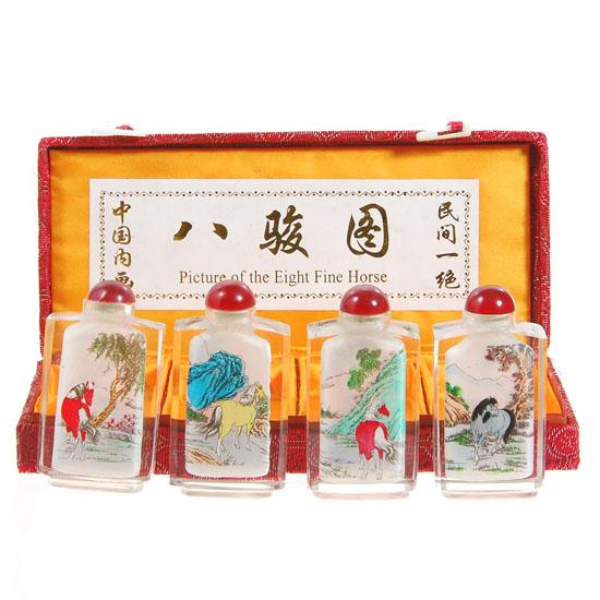 Excellent set of 4 snuff bottles each with a different scene; handpainted from inside; 3.5" each