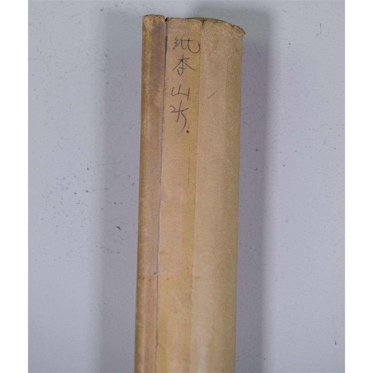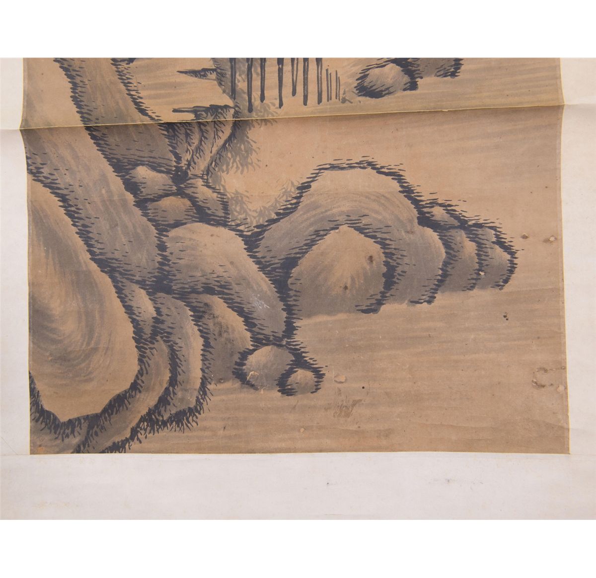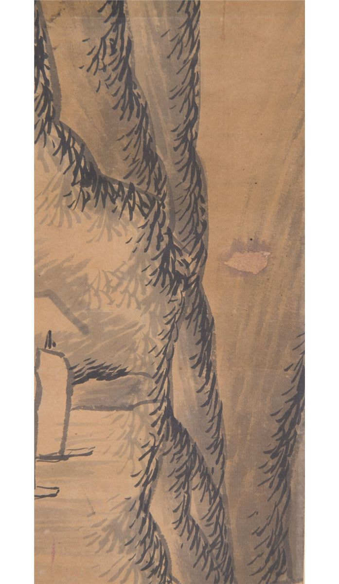 Landscape and village scene; Chinese ink on silk; hanging scroll; 145 cm x 36 cm