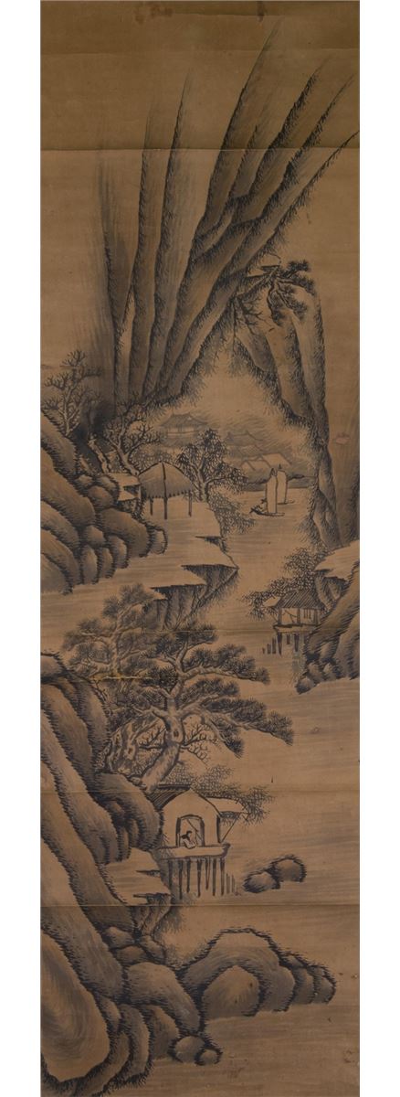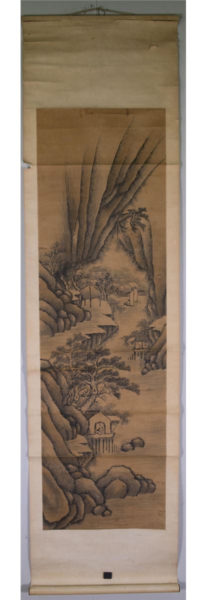 Landscape and village scene; Chinese ink on silk; hanging scroll; 145 cm x 36 cm