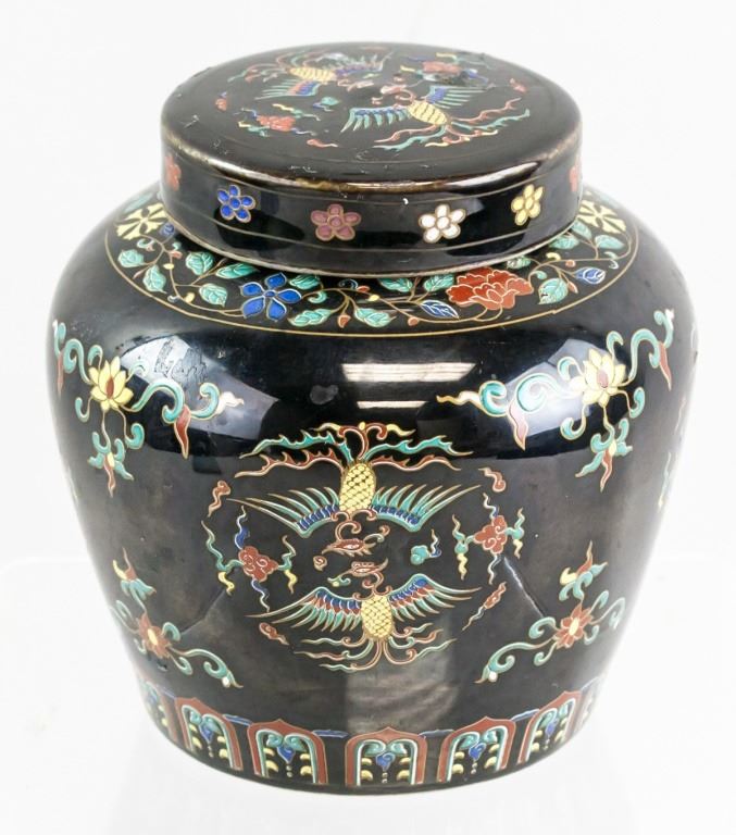 Chinese lacquer jar, with lid. Of black tone with green and yellow motifs. "Tian" character on base. 11 x 11 cm. 179 grams.