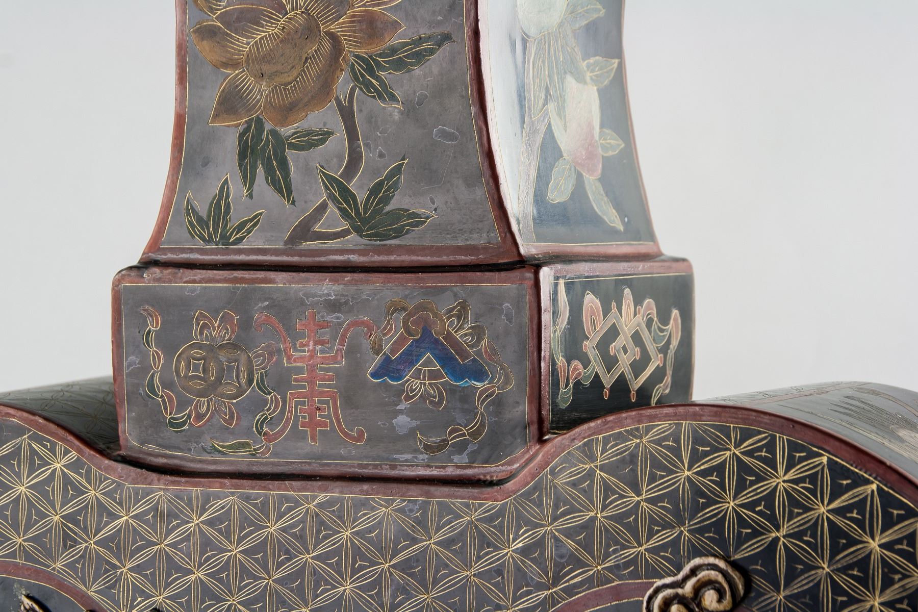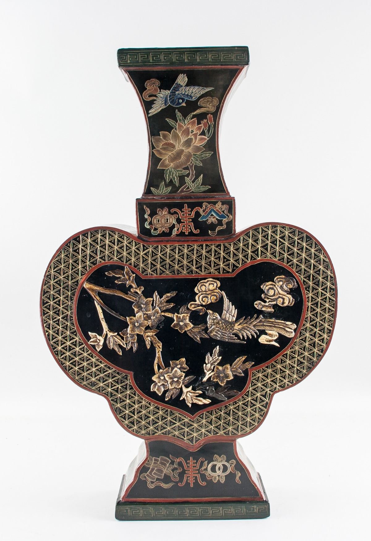 Chinese black and red lacquer wood vase, of ruyi form body, supported on splayed rectangle foot rim, with carving of bird and flower, inlaid and painted with pine, peach, crane and other auspicious symbols,