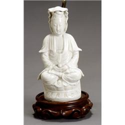 Chinese Blanc-de-Chine Figure of Seated Guanyin, 20th Century, Mounted as a lamp. Chip to rob...