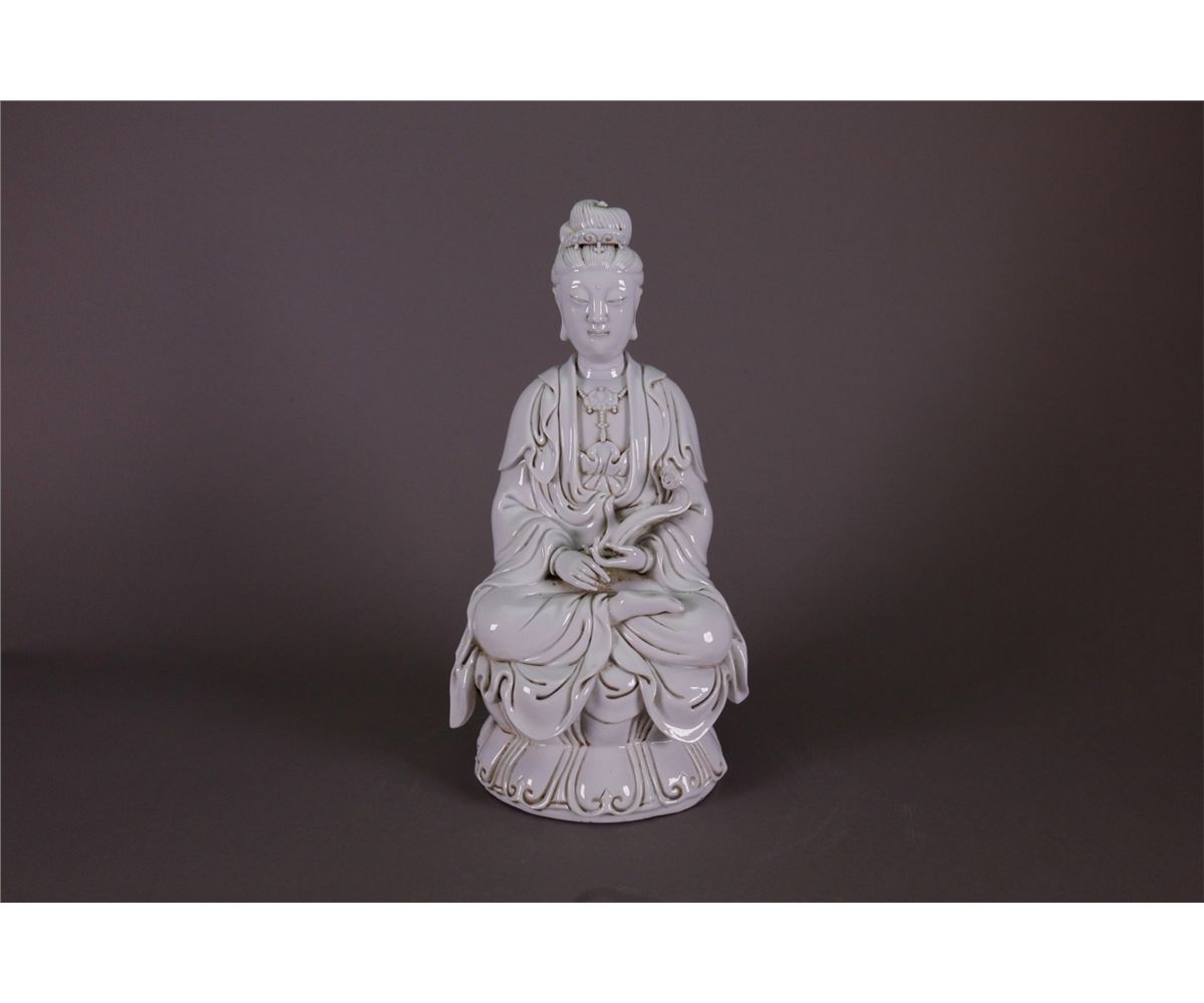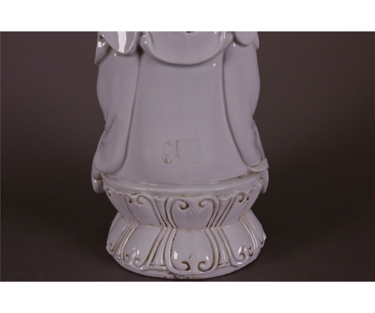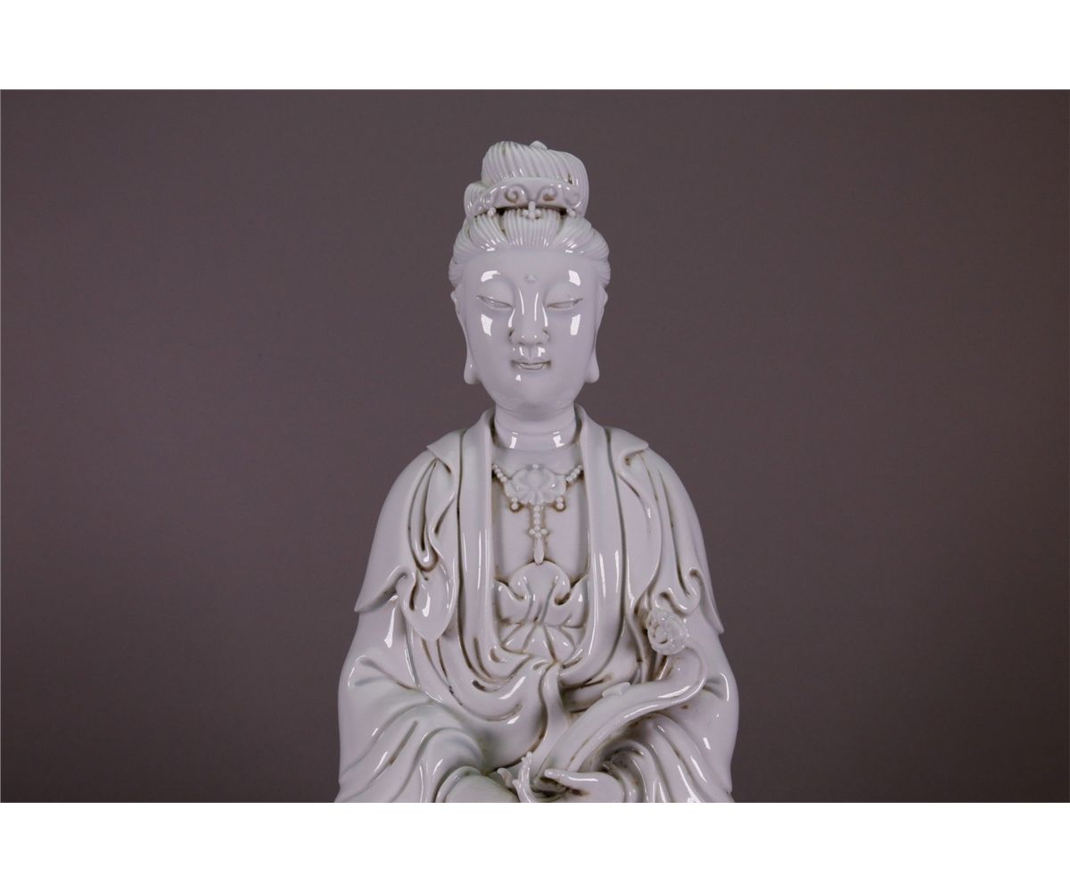 Chinese Blanc de Chine porcelain figure; featuring Guanyin with serene expression sitting on lotus plinth; two Dehua seals on back; H: 30 cm, W: 15 cm, 1451 grams