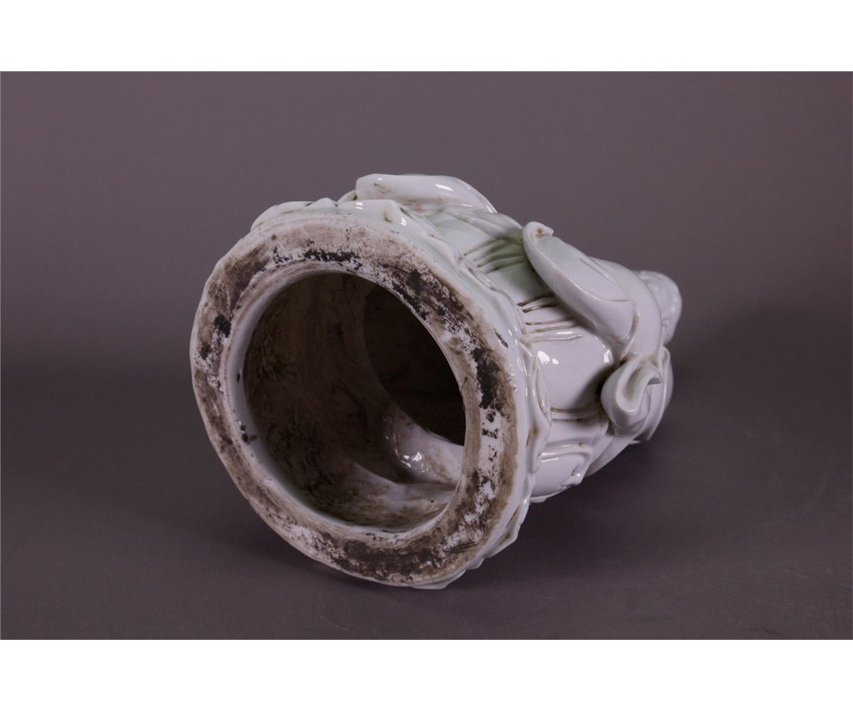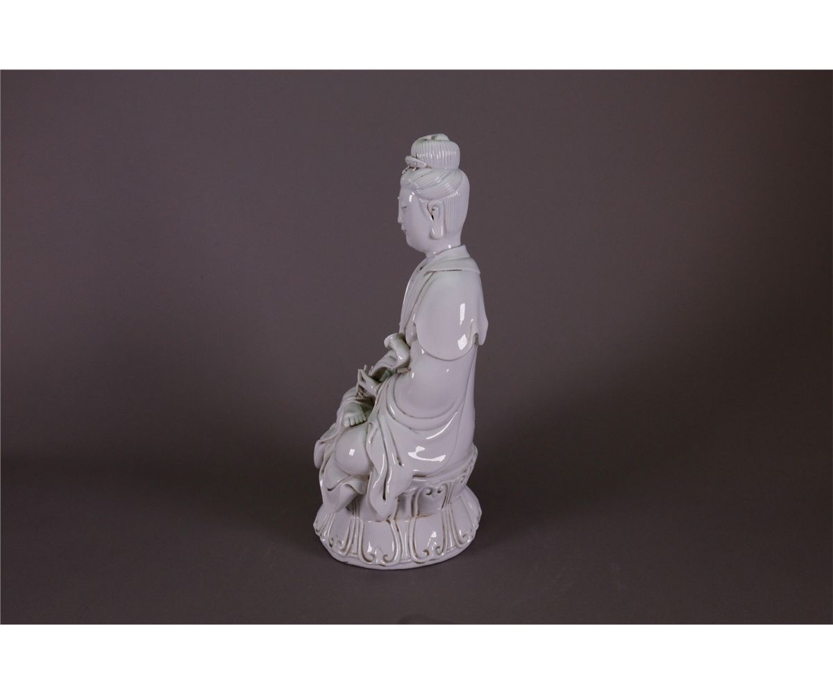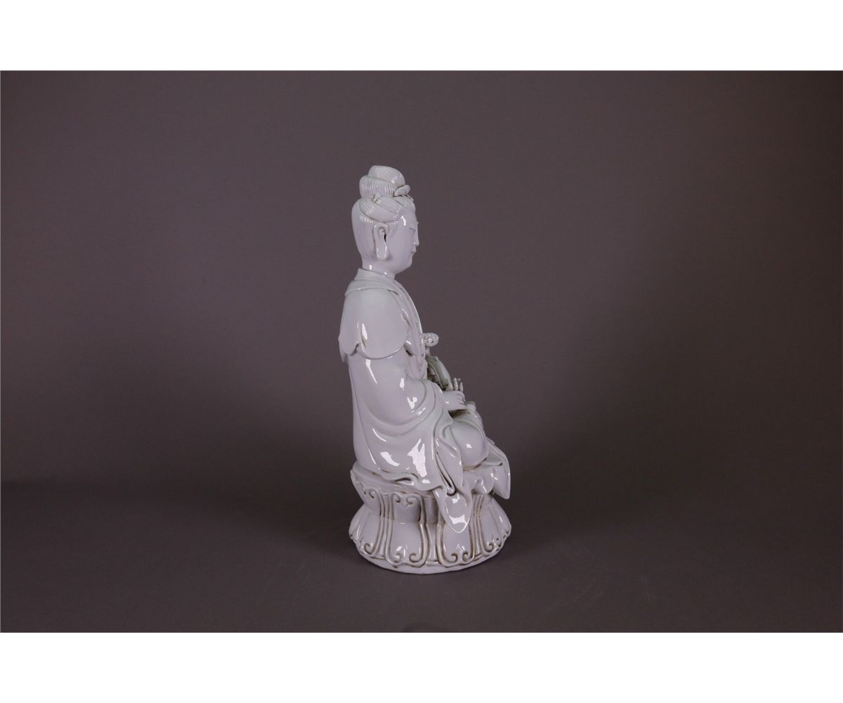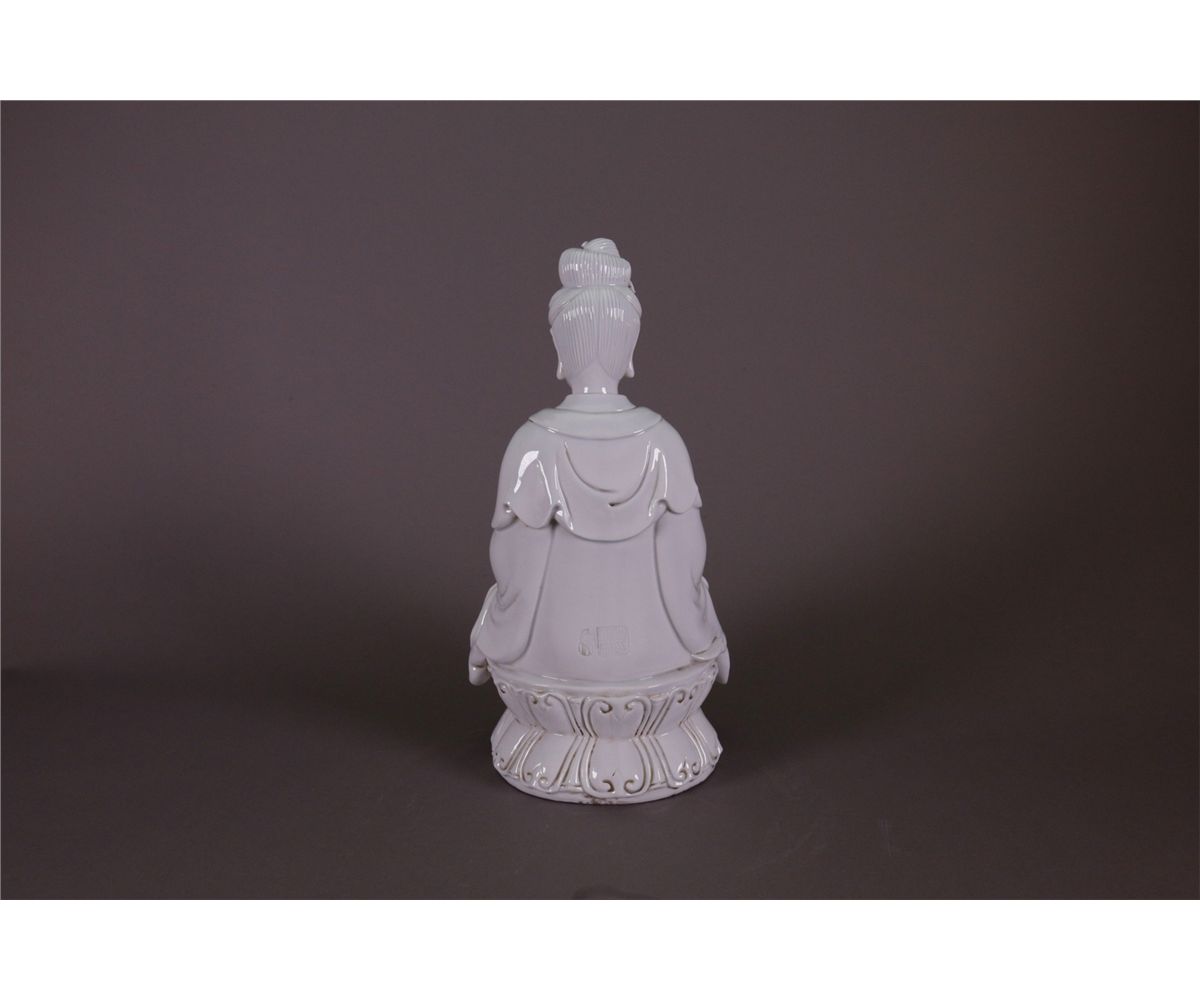 Chinese Blanc de Chine porcelain figure; featuring Guanyin with serene expression sitting on lotus plinth; two Dehua seals on back; H: 30 cm, W: 15 cm, 1451 grams