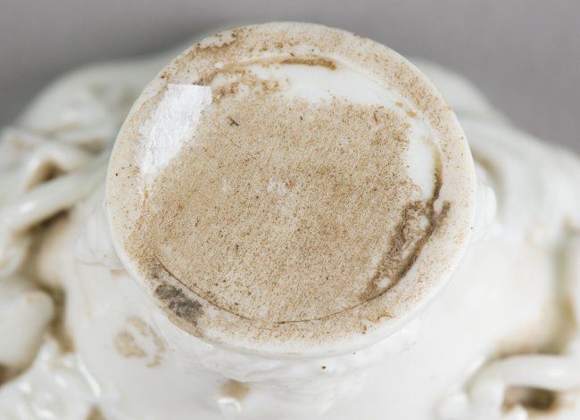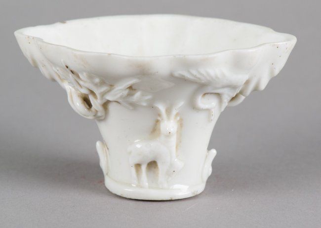 Chinese Blanc de Chine libation cup; the sides of the wine vessel featuring clambering chilong, prunus, crane and deer in relief; H: 6 cm, W: 11 cm, 119 grams
