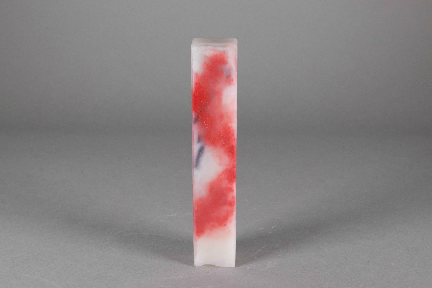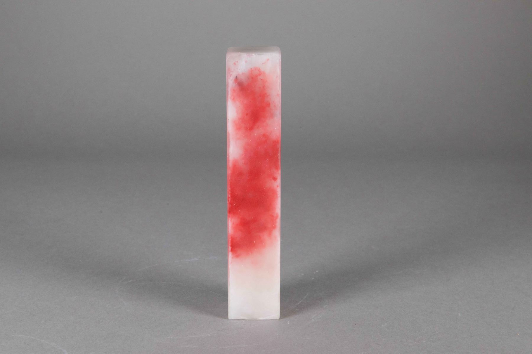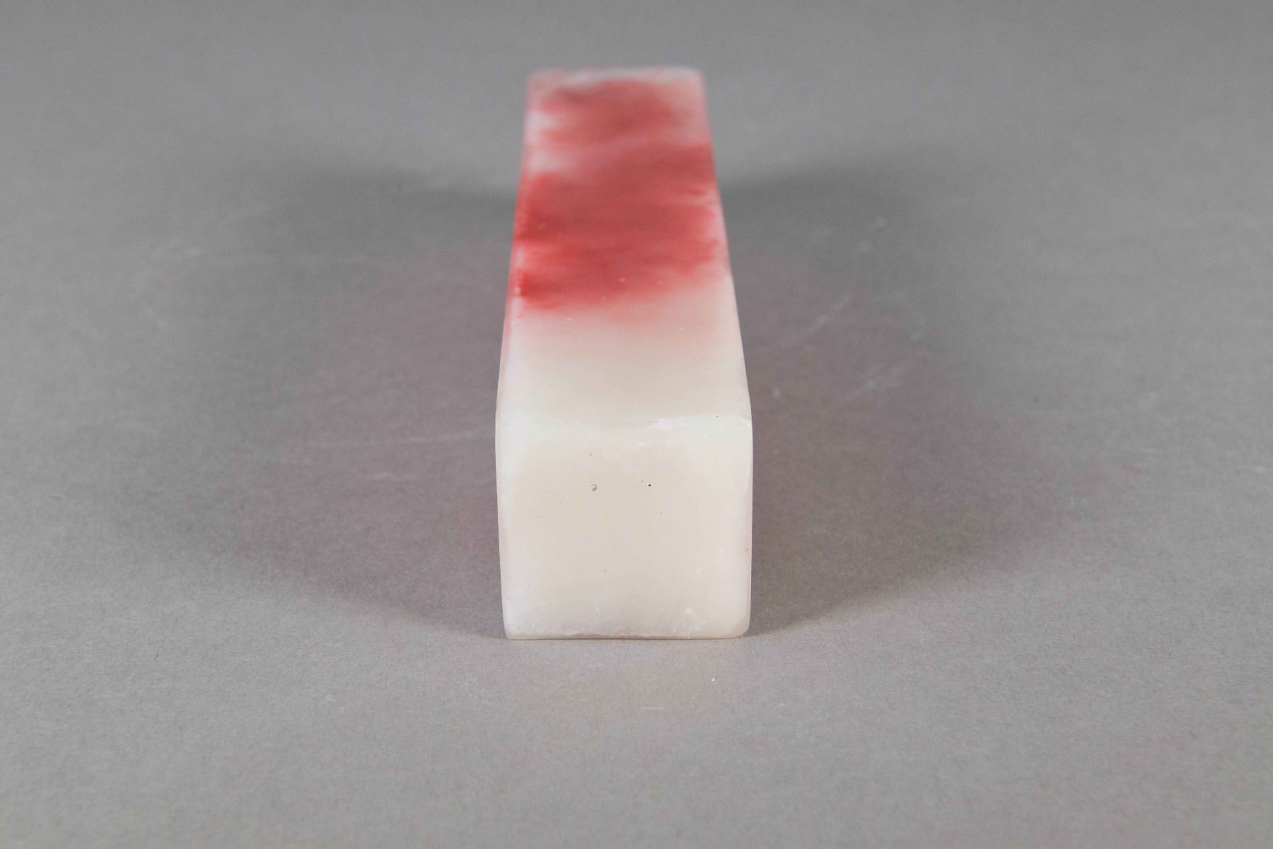 Chinese bloodstone square seal; of off-white tone with red suffusions; H: 18 cm, W: 3 cm, 527 grams