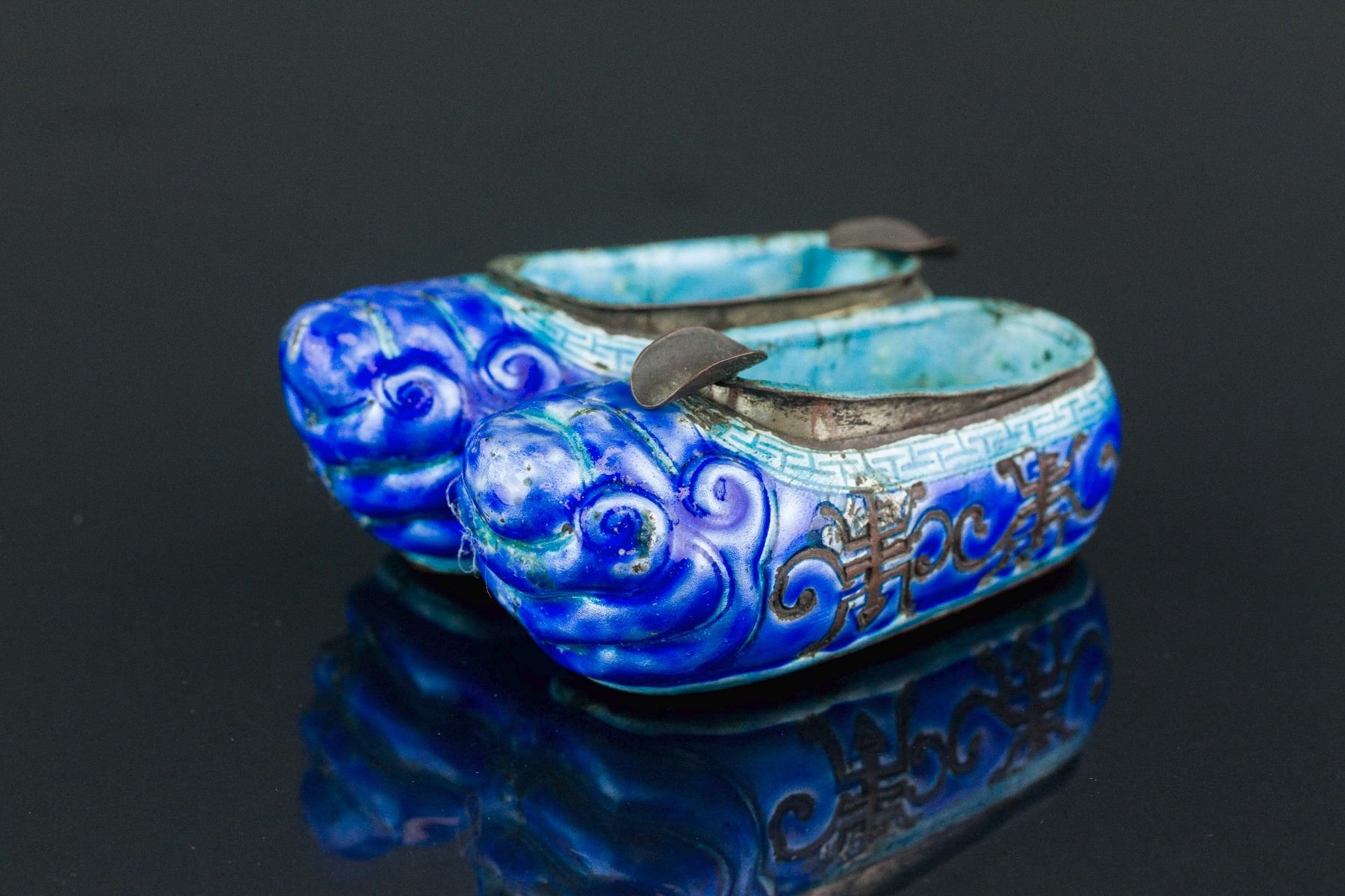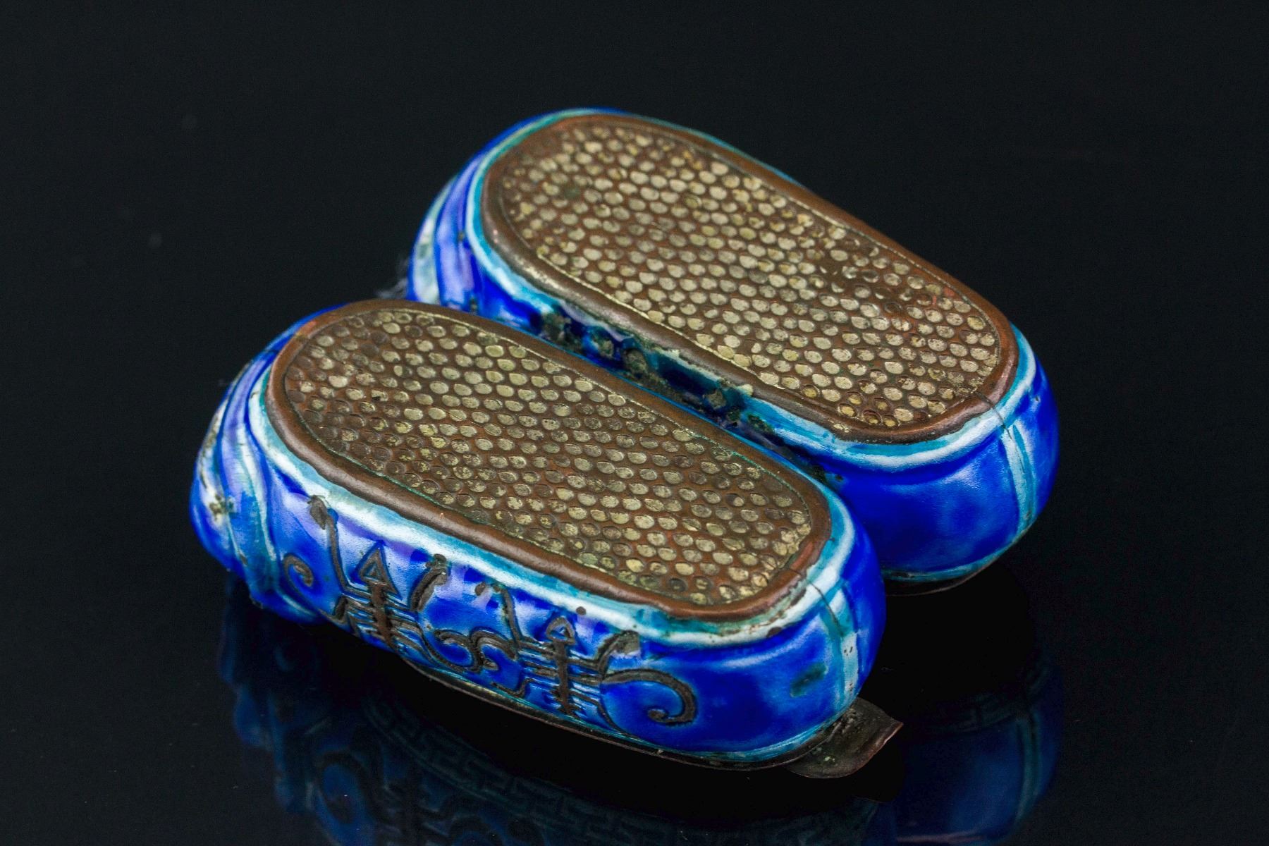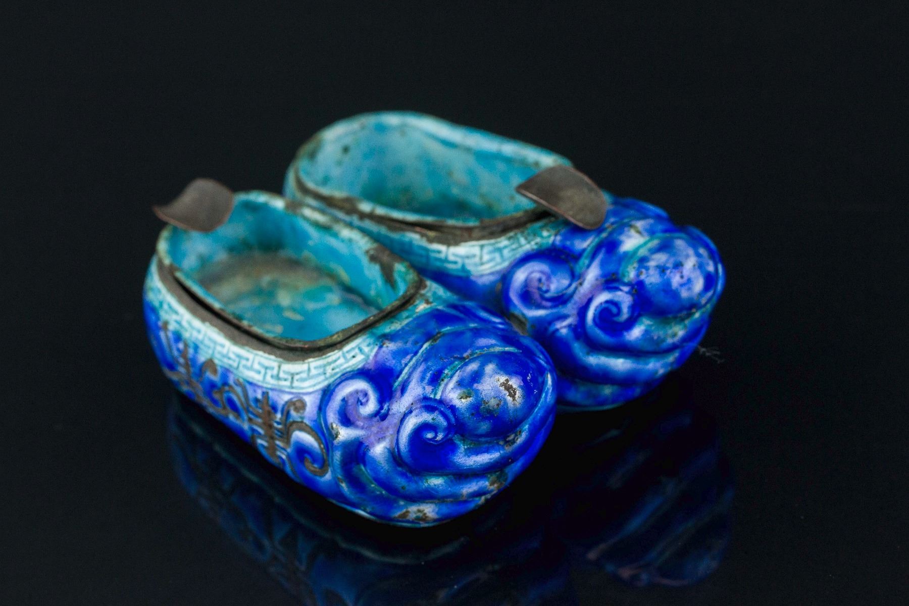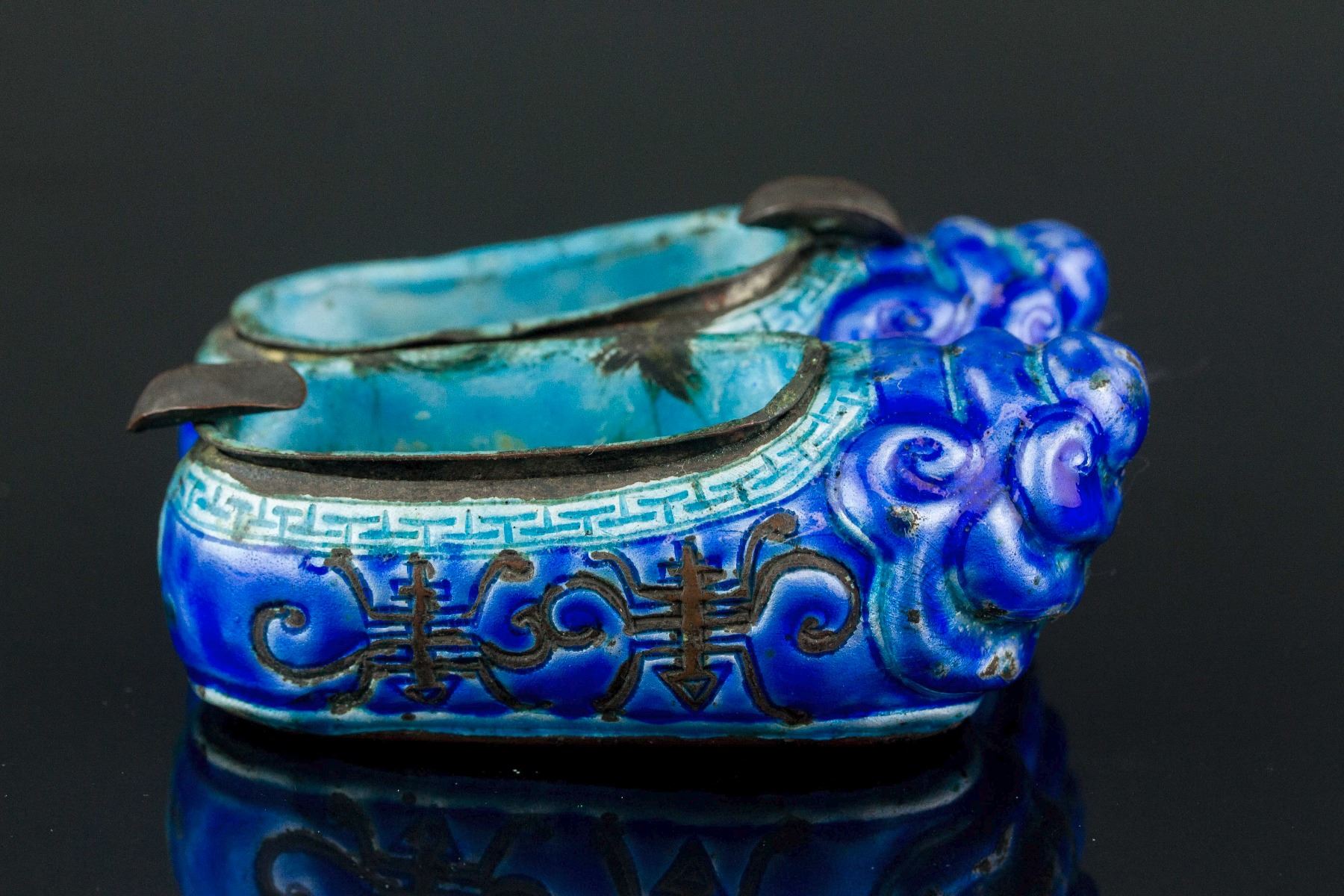 Chinese bronze brush rest; of shoes form; with blue and turquoise enamel; with open tray; decorated with Shou (longevity) pattern; H: 3.5 cm, W: 9 cm, L: 9 cm, 147 grams