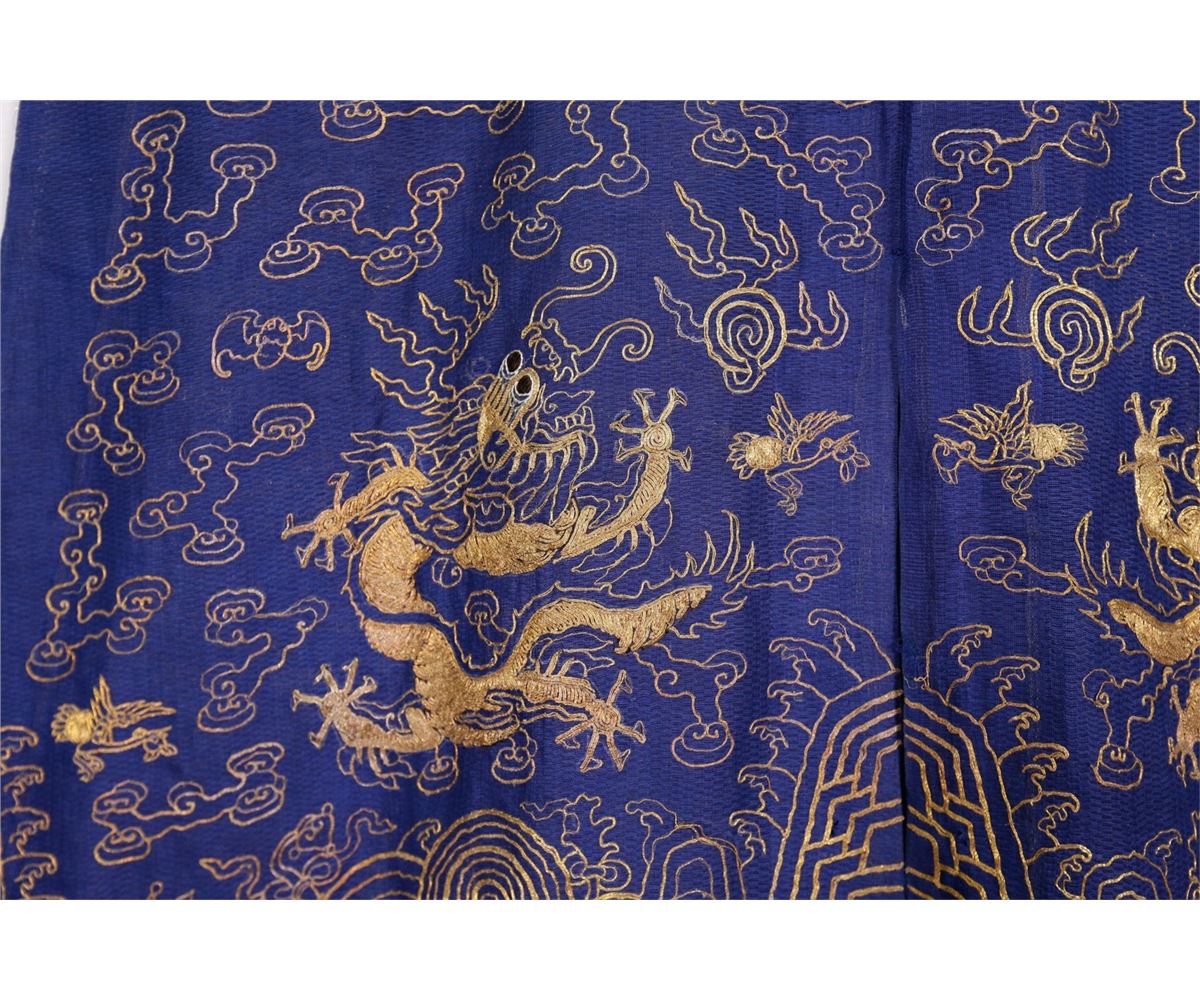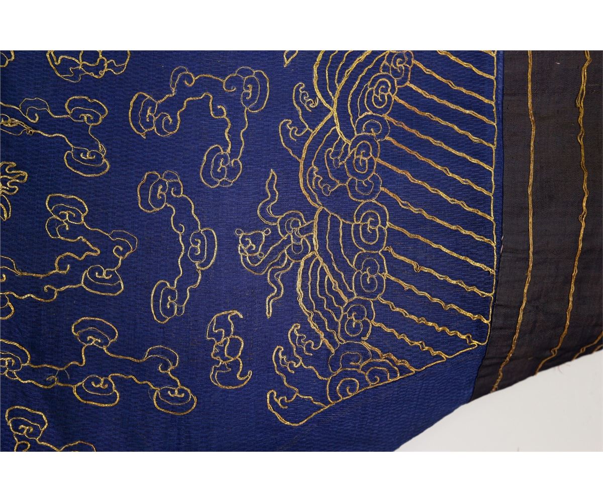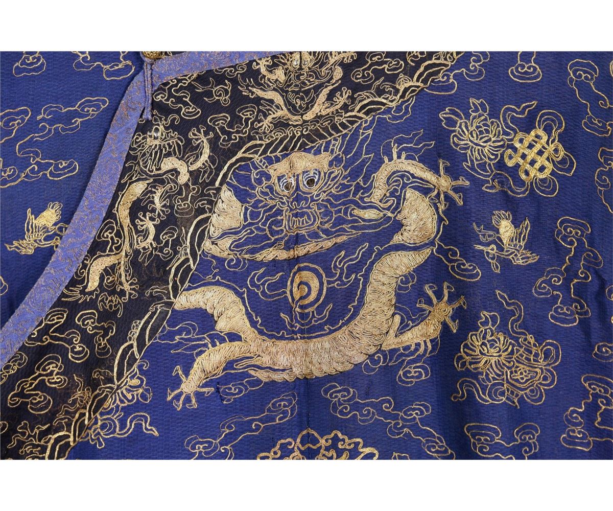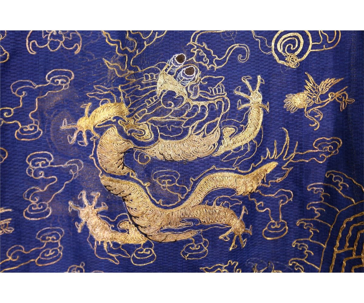 Chinese blue summer gauze court robe Chi-fu; featuring golden thread embroidery of five-clawed dragons amidst lingzhi clouds on the blue gauze ground; above a deep hem of cresting waves and lishui stripes; L: 133 cm, W: 44 cm, Sleeves: 80 cm