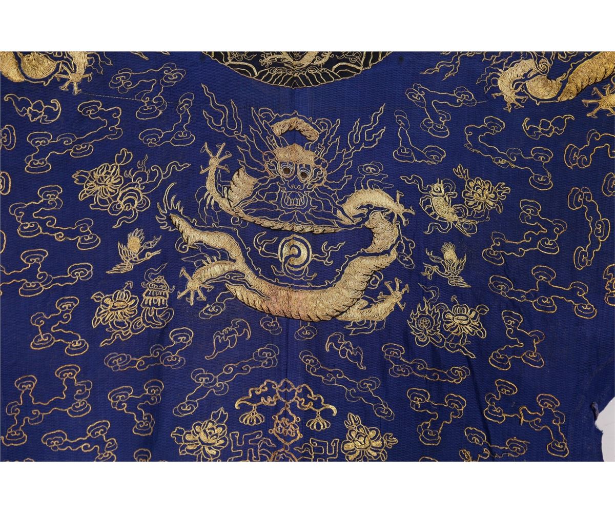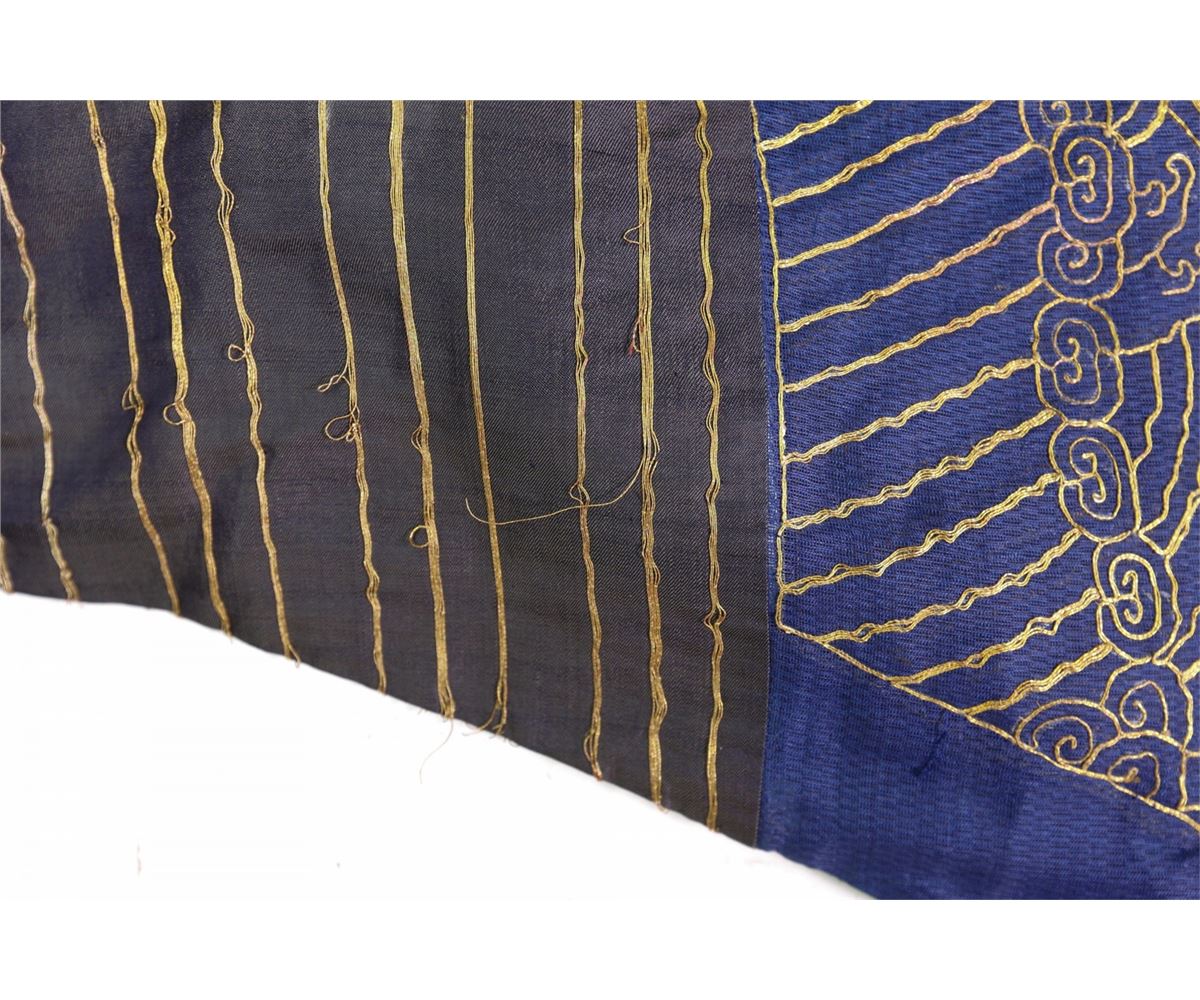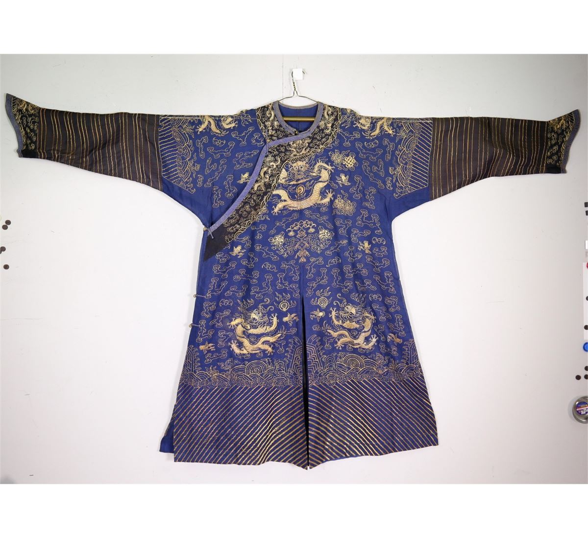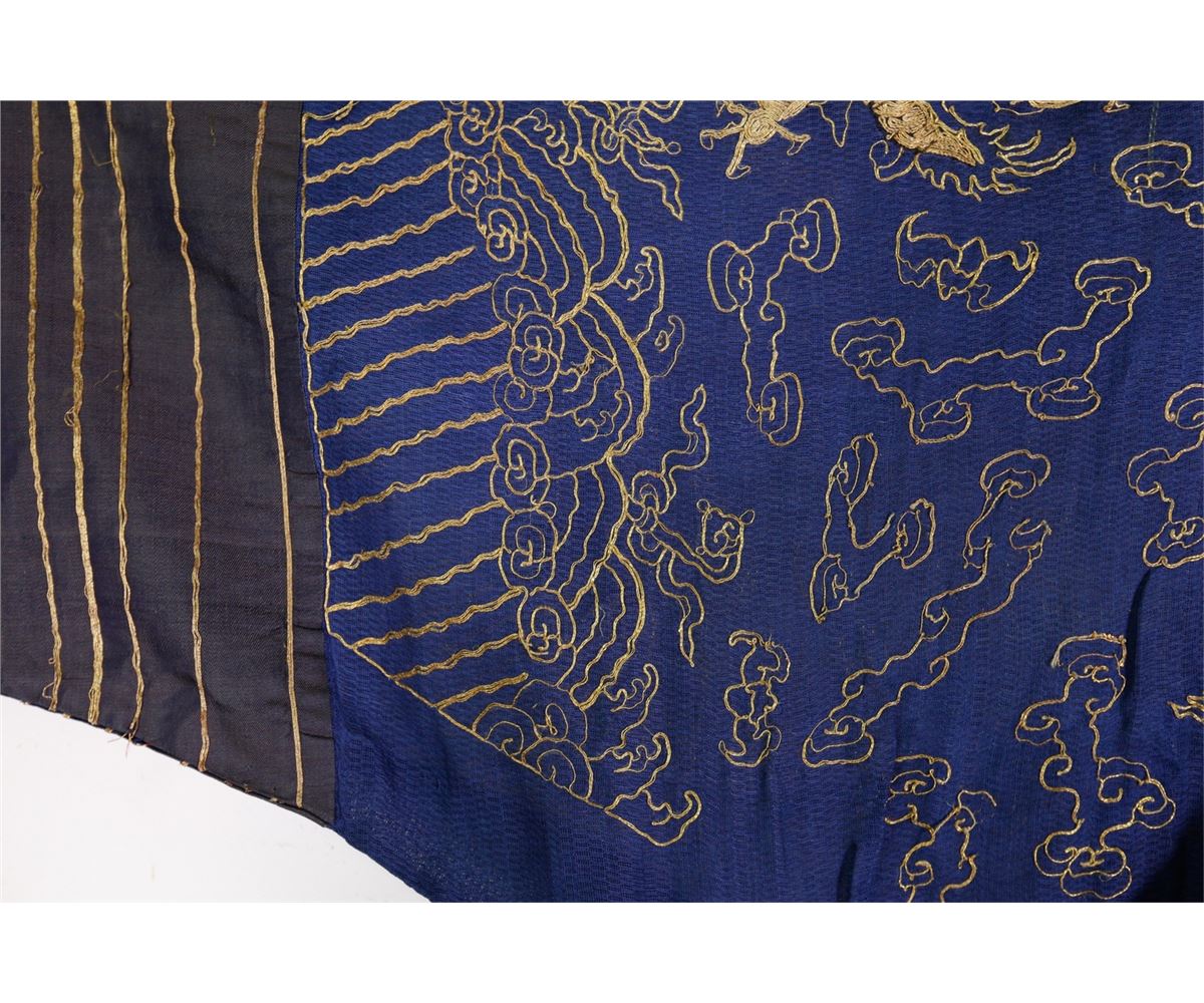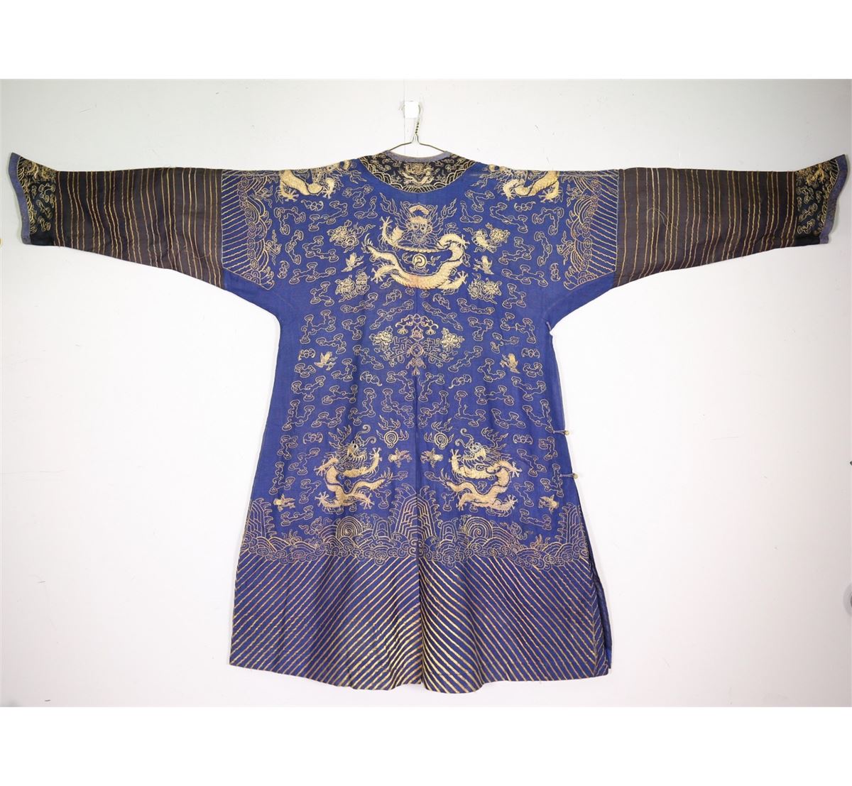 Chinese blue summer gauze court robe Chi-fu; featuring golden thread embroidery of five-clawed dragons amidst lingzhi clouds on the blue gauze ground; above a deep hem of cresting waves and lishui stripes; L: 133 cm, W: 44 cm, Sleeves: 80 cm