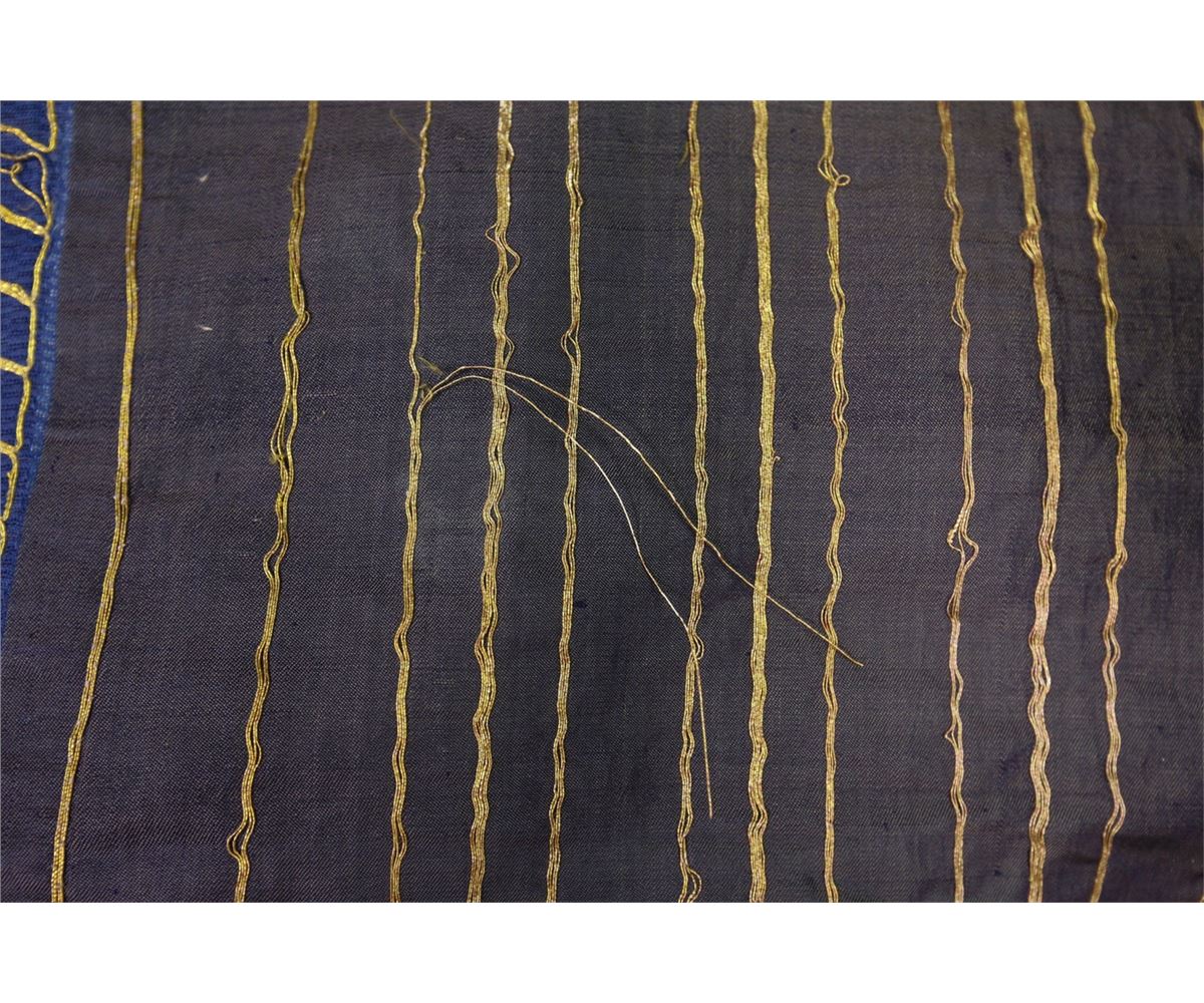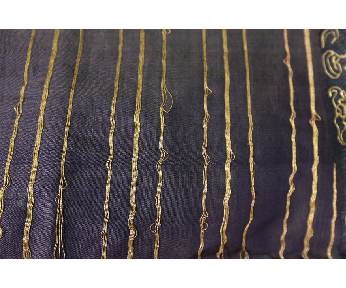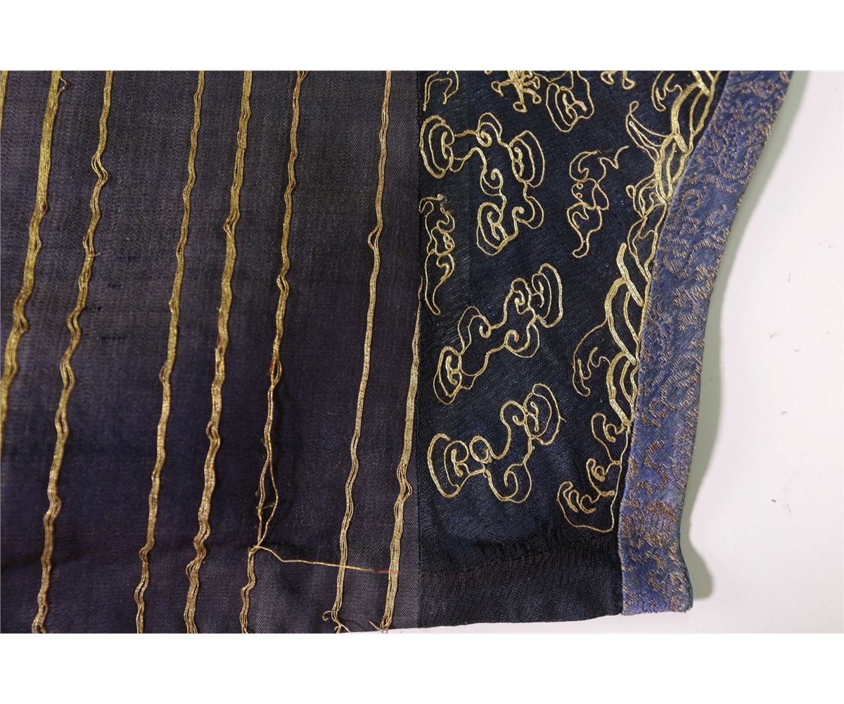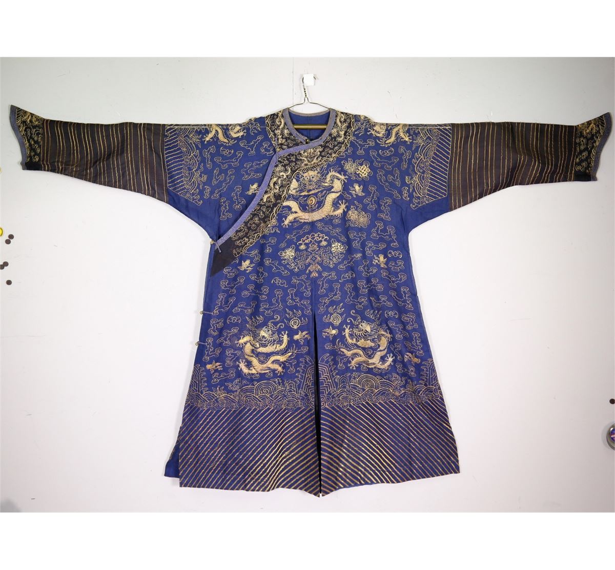 Chinese blue summer gauze court robe Chi-fu; featuring golden thread embroidery of five-clawed dragons amidst lingzhi clouds on the blue gauze ground; above a deep hem of cresting waves and lishui stripes; L: 133 cm, W: 44 cm, Sleeves: 80 cm