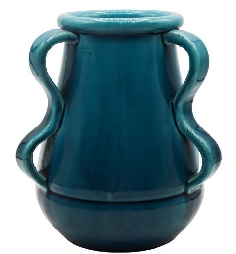 Blue glazed ceramic vase with 3 protruding arms. Size: 7 x 5 1/2 in.