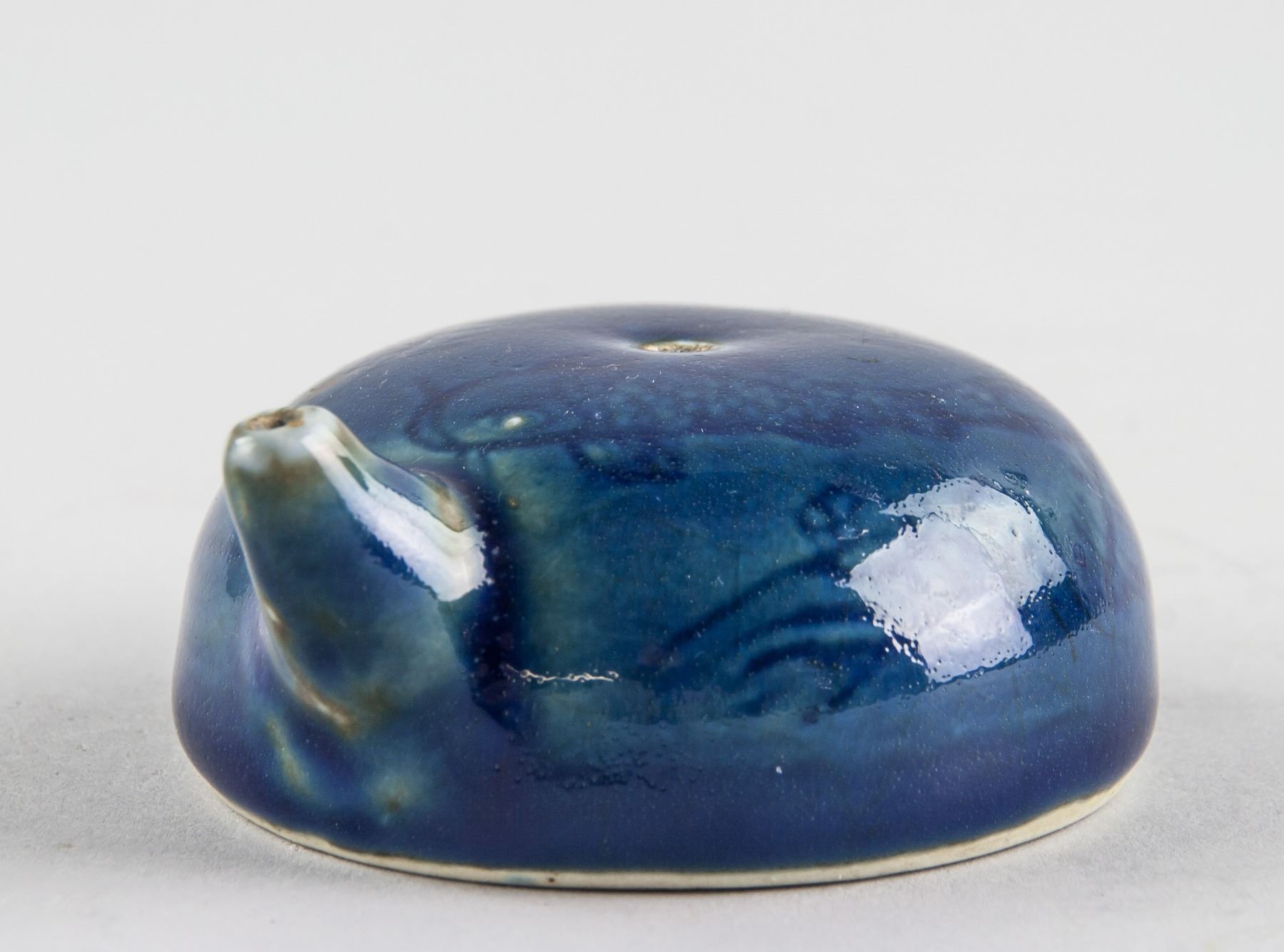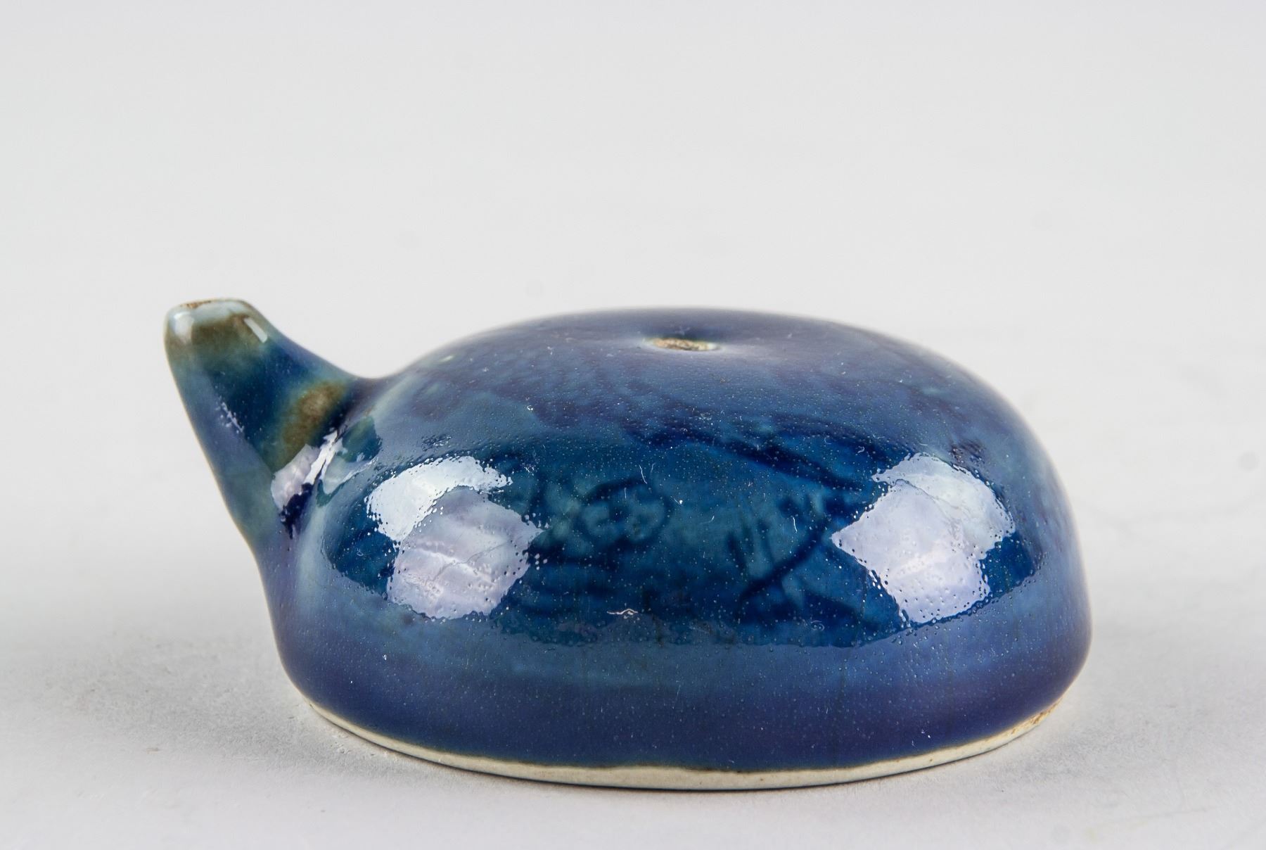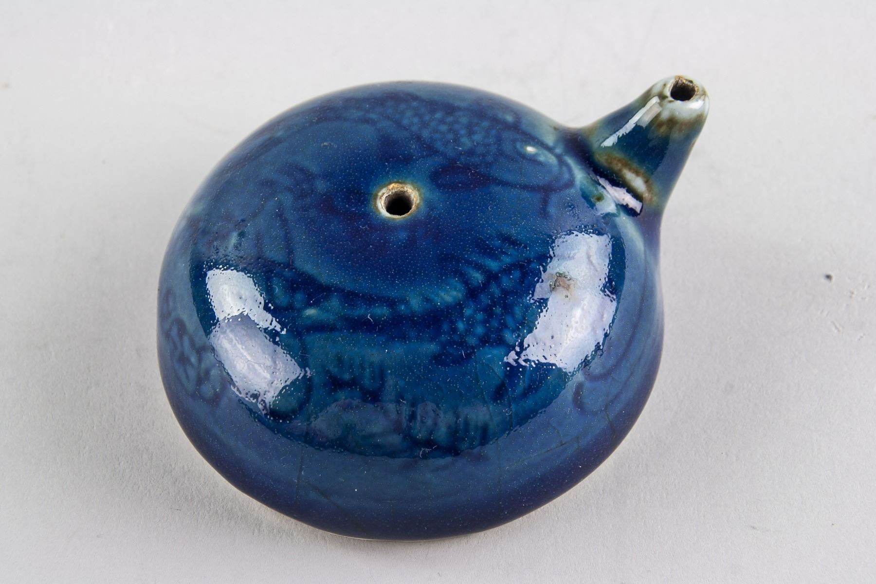 Chinese blue porcelain water dropper; of semi-sphere shape body with short spout; painted fish and water grass; 3.5 cm x 7.8 cm, 103 grams