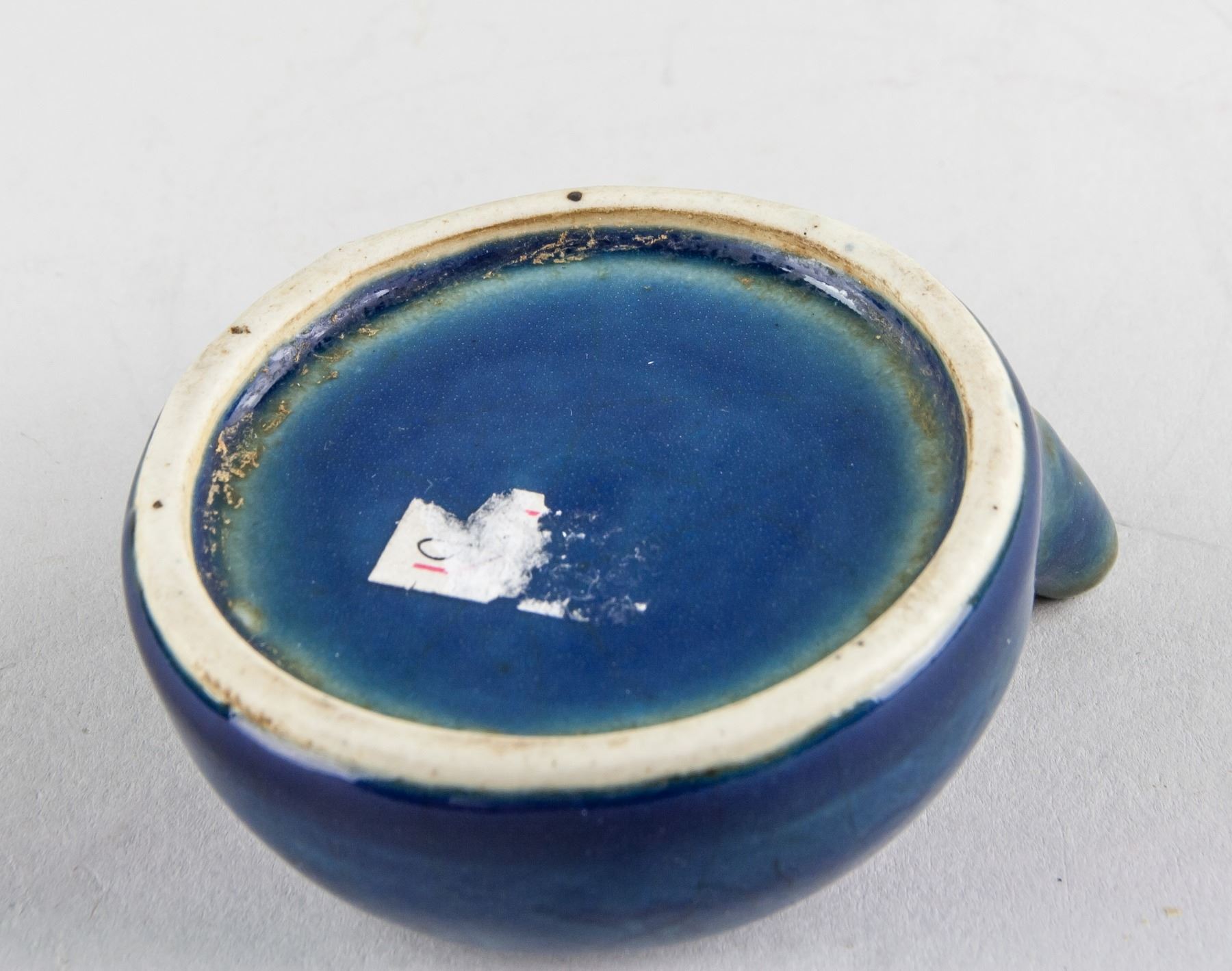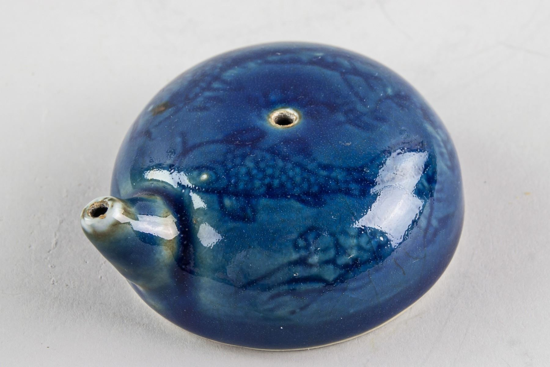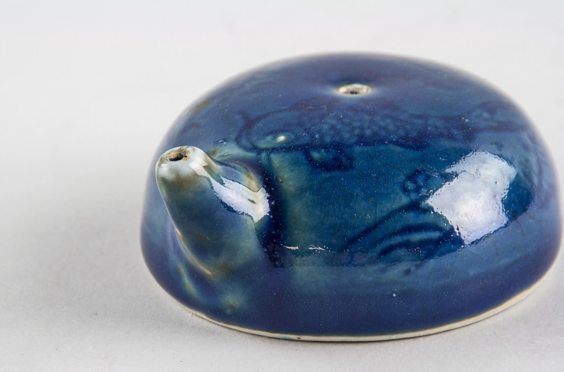 Chinese blue porcelain water dropper; of semi-sphere shape body with short spout; painted fish and water grass; 3.5 cm x 7.8 cm, 103 grams