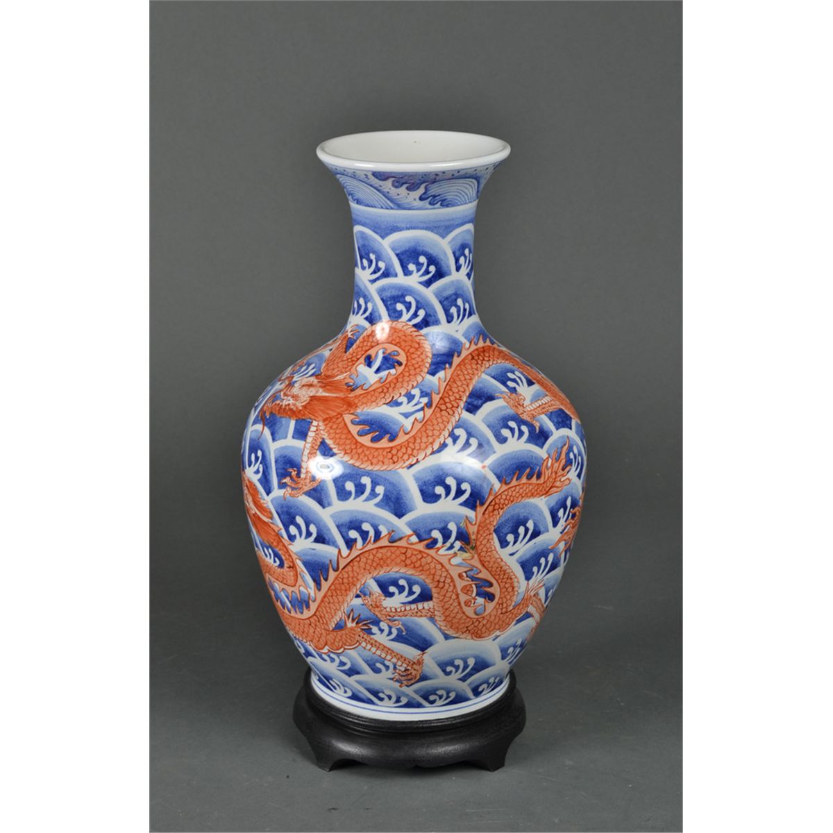 Decorated with dragons chasing a flaming pearl against a blue ground, on a fitted hardwood stand, with character mark to base. 12.5" H, circa 20th century. Private collection Ada, MI.