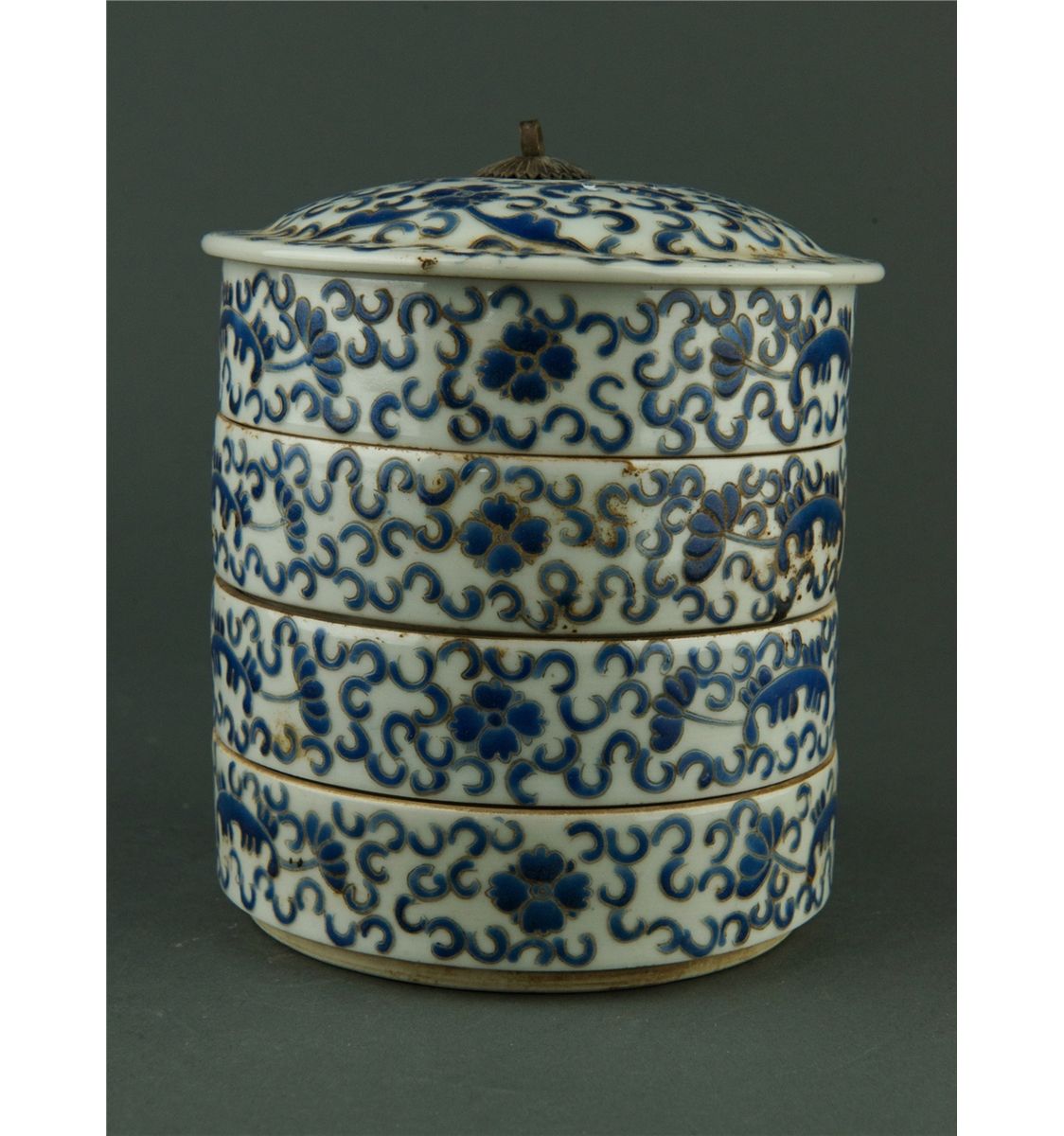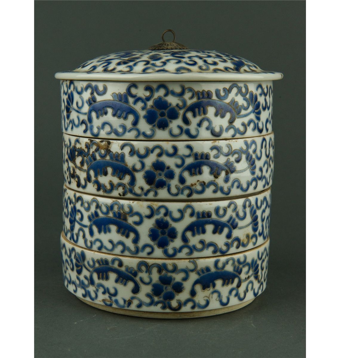 Chinese Blue and White four layer porcelain box, of cylindrical shaped, featuring peonies and sprigs. Bottom with four character red seal. H: 14 cm, D: 12 cm.