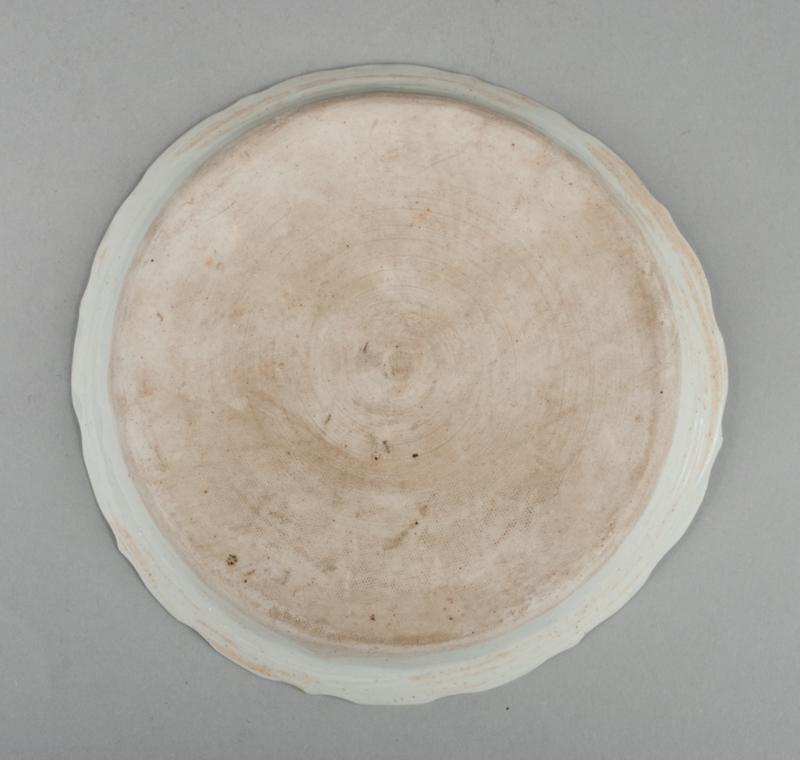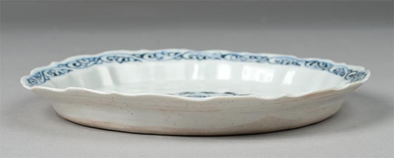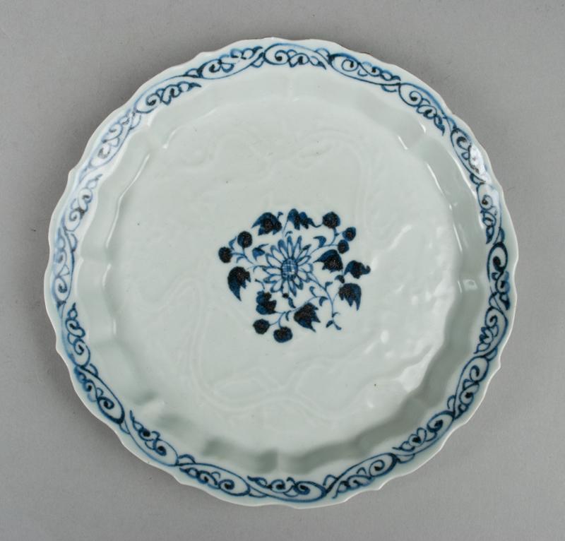 Small plate with scrolling edge decorated with blue scrolling and central floral medallion in blue and black. 6.25" Dia., 20th century.
