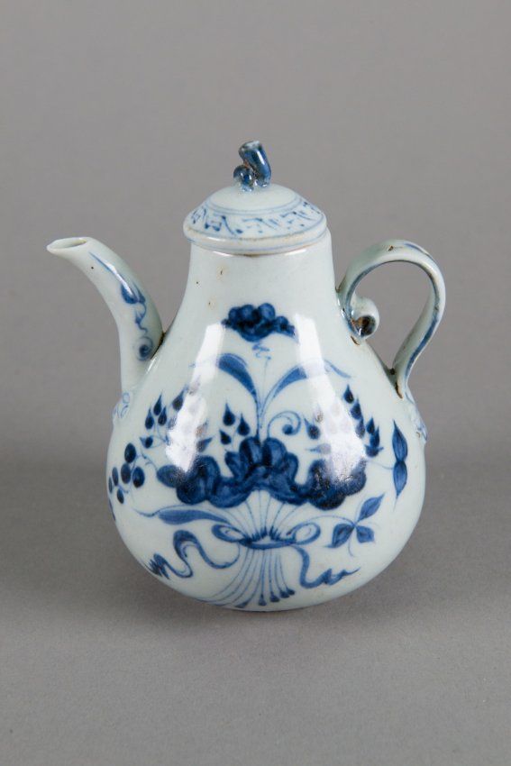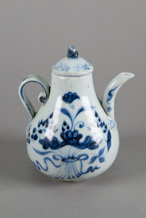 Chinese Ming-style blue and white porcelain tea pot; featuring floral scrolls with lid; H: 10 cm, W: 11 cm, 150 grams