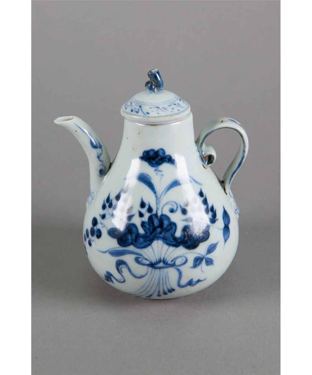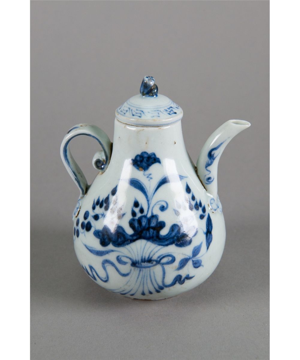 Chinese Ming-style blue and white porcelain tea pot; featuring floral scrolls with lid; H: 10 cm, W: 11 cm, 150 grams