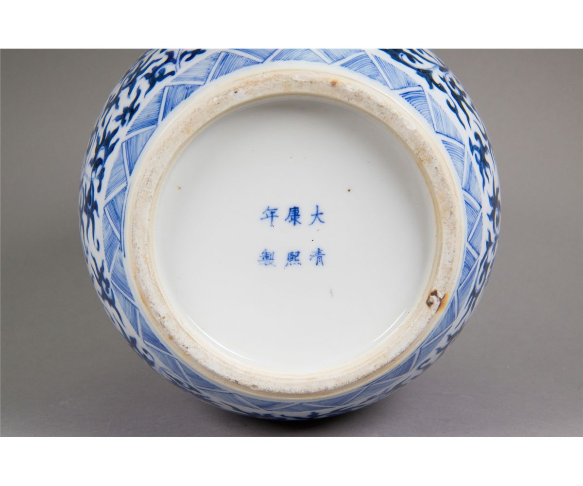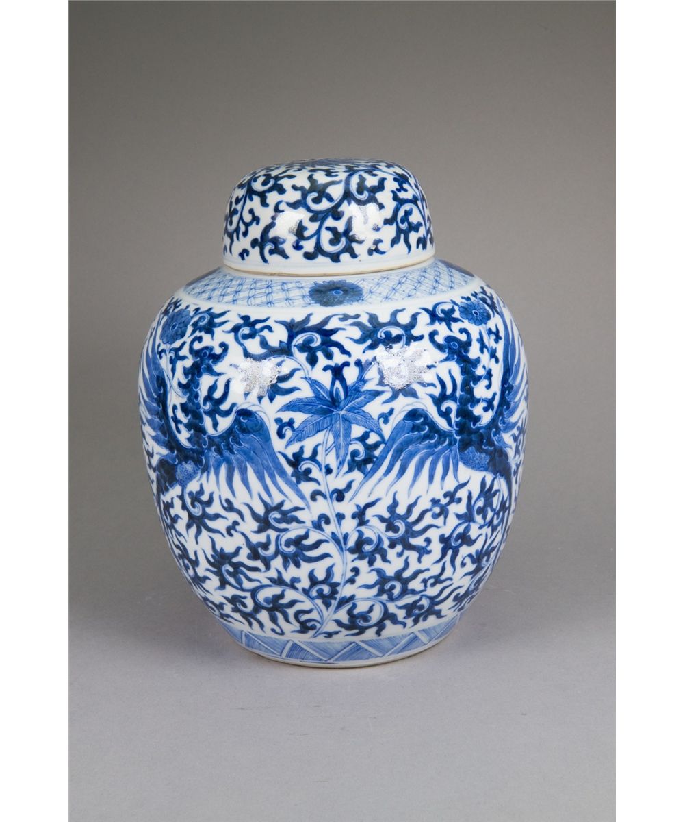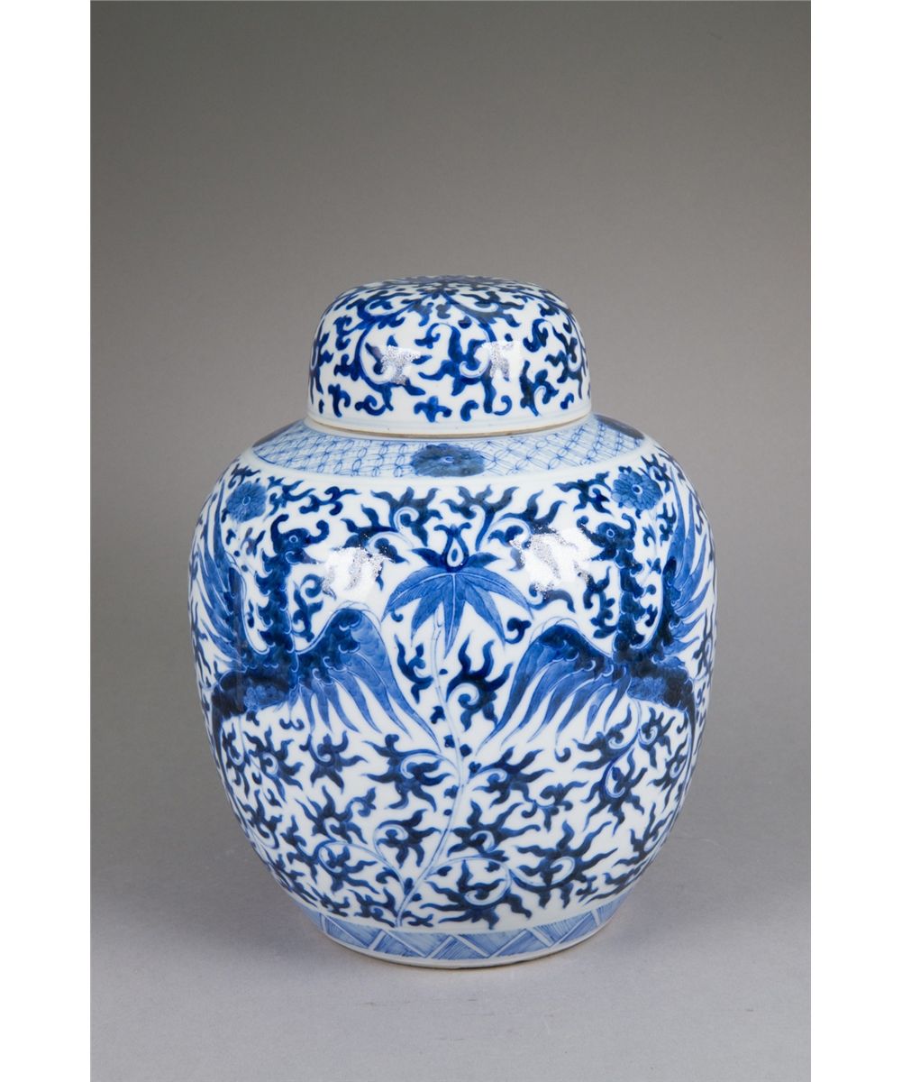 Chinese blue and white porcelain ginger jar; ovoid body featuring phoenix on lotus ground; with domed lid; six-character Kangxi Mark on base; H: 27 cm, D: 20 cm, 2139 grams